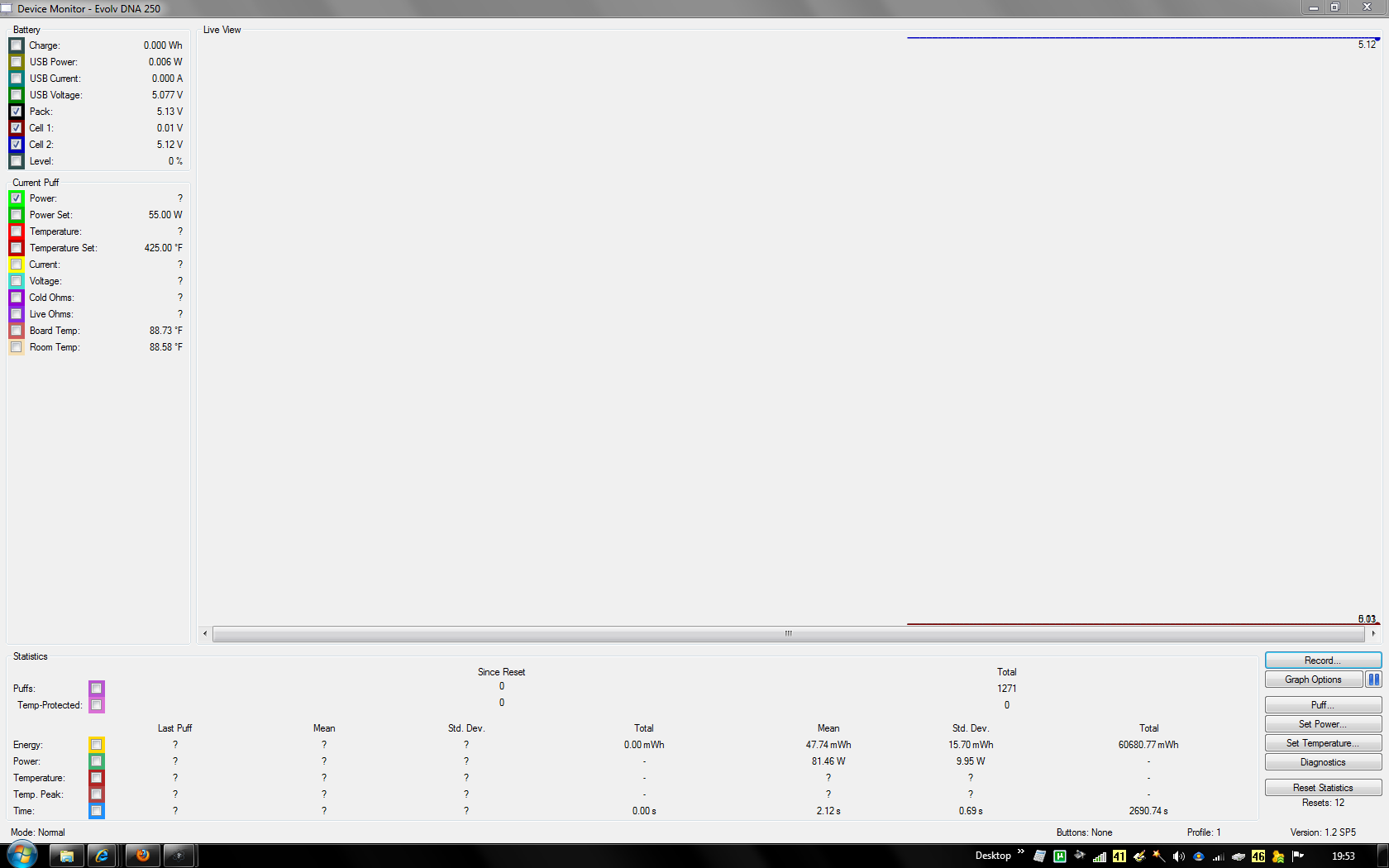 Device manger is displaying 'Cell 1: 0.01v' and 'Cell 2: 5.12v'