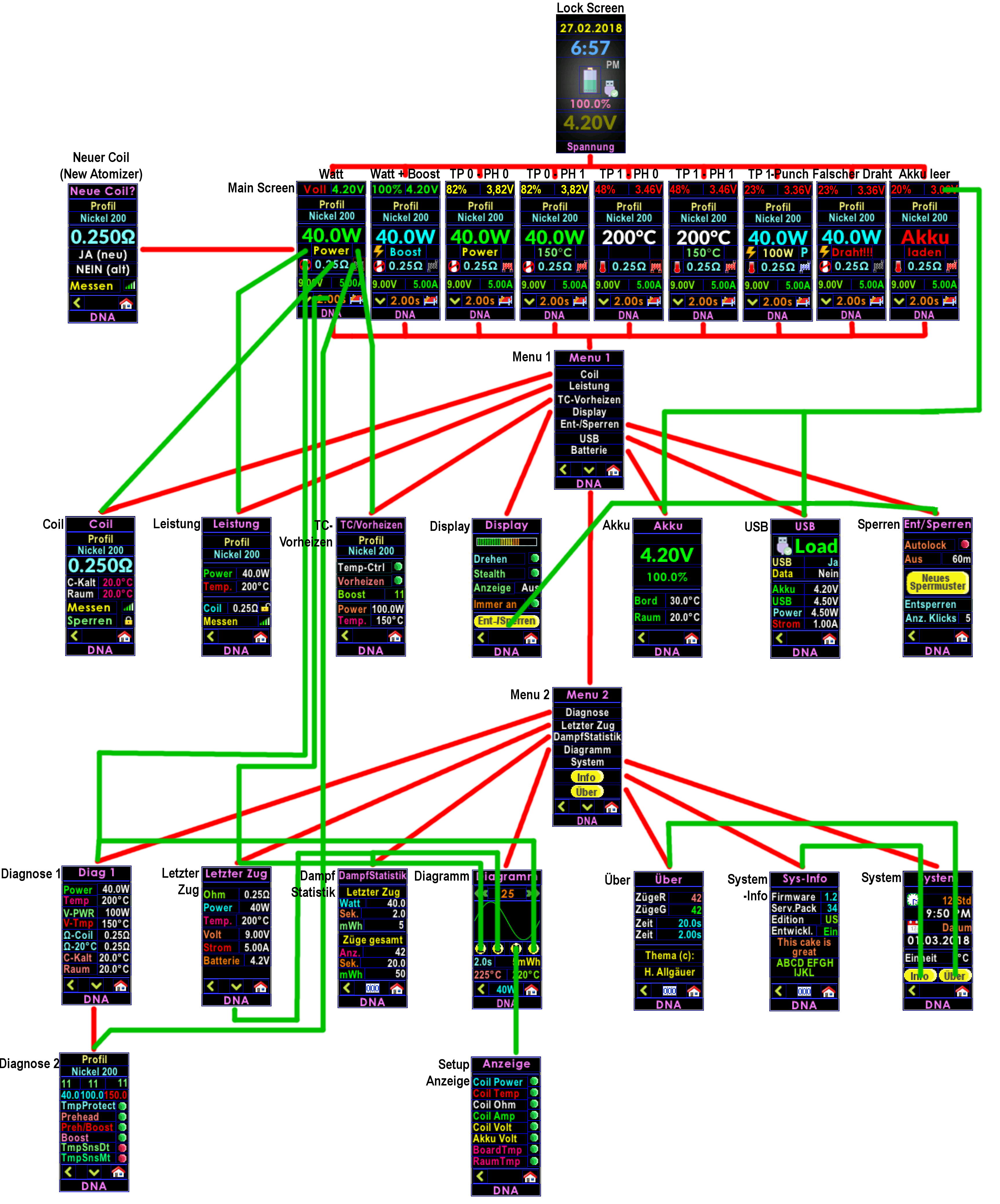 7. Hi, Had a little time today. So I improved and expanded settings and info menues. Also did little changes in other menues. See pic below for new menu-structure. Hope, you have fun with. Regards Mr. Theo Bottomfeeder Black V1.7.0 German for DNA 75C.ecigtheme Mr. Theo Bottomfeeder Black V1.7.0 English for DNA 75C.ecigtheme