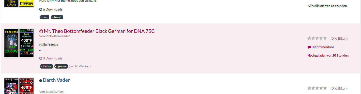 12. Hello, here the updated (and hopefully) final version of Mr. Bottomfeeder-Theme. A little more graphics and more usefull handling Kind regards Mr. Theo Bottomfeeder Black V1.4 German for DNA 75C.ecig Mr. Theo Bottomfeeder Black V1.4 German for DNA 75C.ecigtheme