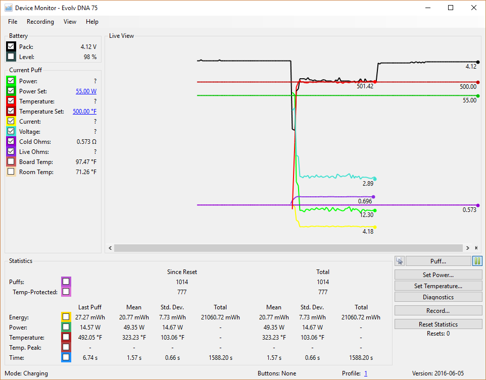 All 3 firings (450, 500, 570) gave the "Temp Protection" warning. I was firing without taking a puff (I'm in my work office) so hopefully these results can tell us something.