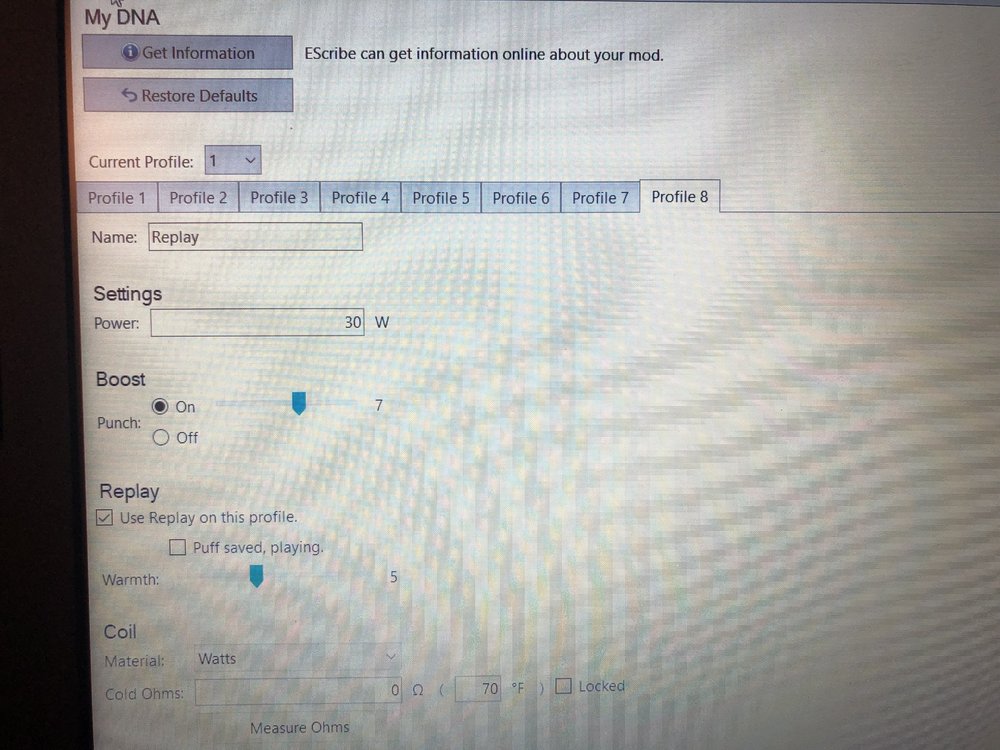 Hi folks. Ive several DNA mods just to say I’m familiar with them. I also have the updates international version of Escribe I recently purchased a LV Mirage that came as described on the box as “Replay Enabled”. However, I just realized there is no Replay option in any of the Materials settings. I usually use TC mode but would like to use Replay as an option. I connected to Escribe and checked off Enable Replay under the Watts profile 1 (and added a 2nd ss 316L curve) then Uploaded to the Device. The other changes I made appear but not the Replay option under the Watts profile. Or any other profile. Any suggestions to get Replay onboard Thanks