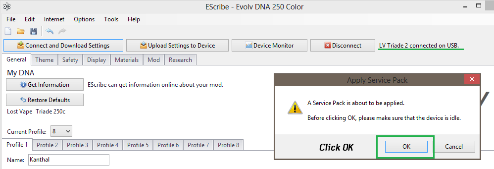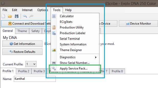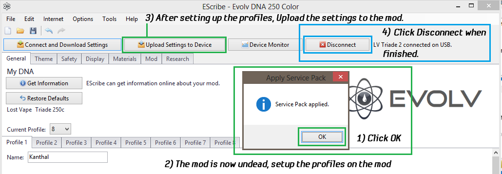 Well I did something really stupid. This mod was a Triade 250c. It was brand new, it never had an atomizer on it. I had setup the profiles and all I wanted to do was put my theme on it. When you upload a theme two boxes popup the first is when Theme Designer is downloading the settings from the mod. When it's done downloading. The popup closes. Then the second popup box comes on and the theme and settings are uploaded to the mod. When the uploading is done the popup closes. When done you just disconnect the mod and vape. Out of the corner of my eye I saw a popup close and I pulled the cable. What I saw next was an error popup on the p/c sreen, saying the upload failed. I checked the mod and it was dead as a stone. So I reconnected the mod and tryed to reupload the theme. I got an error popup stating the download failed and that the firmware had features the mod did not support. (I do not remember the exact message but it was close to what I wrote in the previous sentence.) Instead of an OK button in the popup it said Continue instead. I clicked on continue, the popup closed and nothing else happened. How to fix this: 1) Remove the batteries. This will not work if the batteries are not removed/disconnected!!!!! If your mod has a lipo battery and if it is soldered to the board you will have to cut the negative lead. Tape up the end of the cut wire as soon as possible. (the reason to cut the negative wire is, if the end of the batteries negative lead touches the mods case there will not be a short circuit). 2) Open Escribe and connect the mod. Do not disconnect the USB cable until the steps are completed. (If EScribe fails to recognize the mod and will not open it. It is unforunately dead.) 3) In Ecribe, click on the tools tab, Click on Apply Service Pack. The pictures below show the steps. The first time I applied the service pack (firmware) it went to 96% stopped and failed with this error, "the firmare has features that the firmware does not support" Flash the sevice pack again. This time it went to 96% and stopped, the progress counter counted for ~ 30 seconds. Then it jumped to 98% and counted for about 40 seconds. It jumped to 100% sat there for second. At that point the popup closed and the the sevice pack upload success popup displayed. I then reset my profiles and uploaded the settings. Click "Disconnect" on EScibe. The mod is saved! So at this point. I wondered what would happen if you pulled the cable during a sevice pack update?..... Well hold my beer. I name my mods when I set them up in Escribe. When I borked the theme upload and connected the mod to EScribe, the mods name was in the mod selection box. I had to do the same as above but this time the mods name was 250c. I had to select how many batteries the mod had. Then the mod connected to EScribe. Everything was at default even the materials were reset. It took reflashing the service pack three times to fix it this time. Well hold my beer again. Twice! The DNA 75c reacts the same as the 250c. But after borking the theme upload I only had to flash the service pack once. After borking the service pack it took two flashes instead of three. (If EScribe fails to recognize the mod and will not open it. It is unforunately dead.) This issue can happen even if you do not do anything stupid. Make for sure the USB cable is a good one. Avoid using the ones that supplied with the mod. They are the cheapest cable the manufacturer can find to reduce their cost per unit. Please Do Not do this to see if it works. If your mod is Not Dead do not tempt Mr Murphy. If you have a dead mod, you really can't hurt something dead, try it. You might fix your mod! Today the Triade has 56,252 puffs and has been perfect. The 75c (a VT-75D) has 63,633 puffs without issue. Hope this helps.....JT