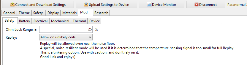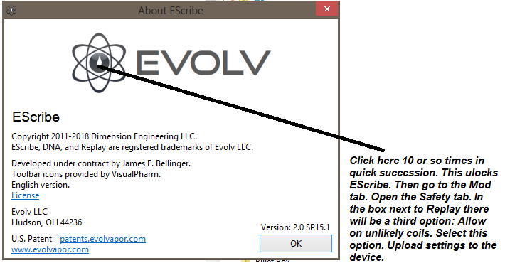 Conrad, It might or might not work with your complex coil. If you want to try it, here is how to activate the new option. Open EScibe and connect your mod. At the top of the window click Help , About EScribe. Look at the picture below. Then in EScribe click the mod tab and open the safety tab. Next to Replay you will find the option to Allow on unlikely coils. It will look like the second picture. I have had no problem with the dual N80 claptons in my Velocity and the .5 ohm N80 coil in my Subtank+. I have vaped them dry with just a hint of cotton taste, which where I stopped and redripped or refilled the Subtank+. When I say dry I mean no visible juice on the wick or in the tank. I think its worth a try to see. JT