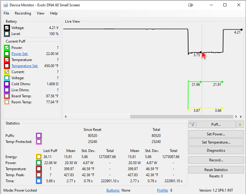 I was getting a weak battery indication, so I hooked it up to the computer and was seeing voltage drop some where around 0.6-1v (didn't get a screen shot). So I started cleaning all of the contact points: Battery cover threads and contacts, positive contact, Ground contact, 510 pin, 510 ground contact, the screws and their holes, that connect the two half's of the mod. Best I can get is a .46 voltage drop. I'm use to seeing a 0.2 voltage drop on my Dani 25, with the same atomizers and builds. So started investigating and tinkering. I went as far as to loosen up the two half's of the XvoStickPro, so I could use one of my Samsung INR21700-40Ts, that I run in my Dani 25. It showed similar voltage drop to the Vapecell INR26650 G53, with in a couple hundredths of a volt... Is a 0.5 voltage drop, the best that I'm going to get or should I be expecting to see closer to something closer to the 0.2 voltage drop, that I get on my Dani 25 or am I comparing apples to oranges?.. Best I've I can get, after cleaning all contacts and threads on my XvoStickPro running a Vapcell INR26650 G53: Originally it came with a DNA 40, back in 2018 I converted it to a DNA 60 for SSTC. https://i.imgur.com/kkAmiUL.jpg