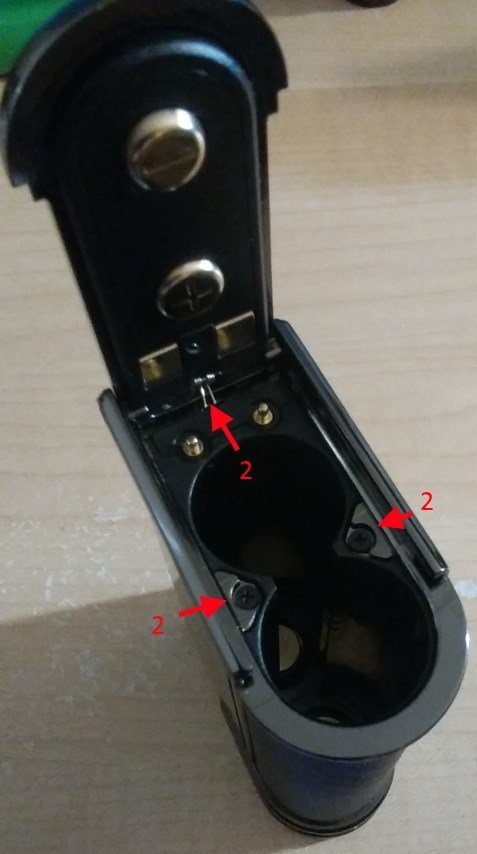 First, take out your batteries. Take out 2 phillips screws by battery door hinge at the bottom front of the mod (marked as 1), remove the battery door. Under the battery door is 1 screw, then 2 more between the batteries (marked as 2, though one of them is under the battery door). Once these 3 screws are out with some gentle pressure the bottom of the mod just pops off directly down. Take out the 3 screws around the 510 connector, and the 2 screws on either side of the frame on the opposite end of the two for the battery door (marked as 3). Once the bottom is off and those other 5 screws are out, you can grab that front panel part down below the usb port (marked as 4) and pop it forward and up. This gives you access to the buttons and piece I was taking photos of previously.