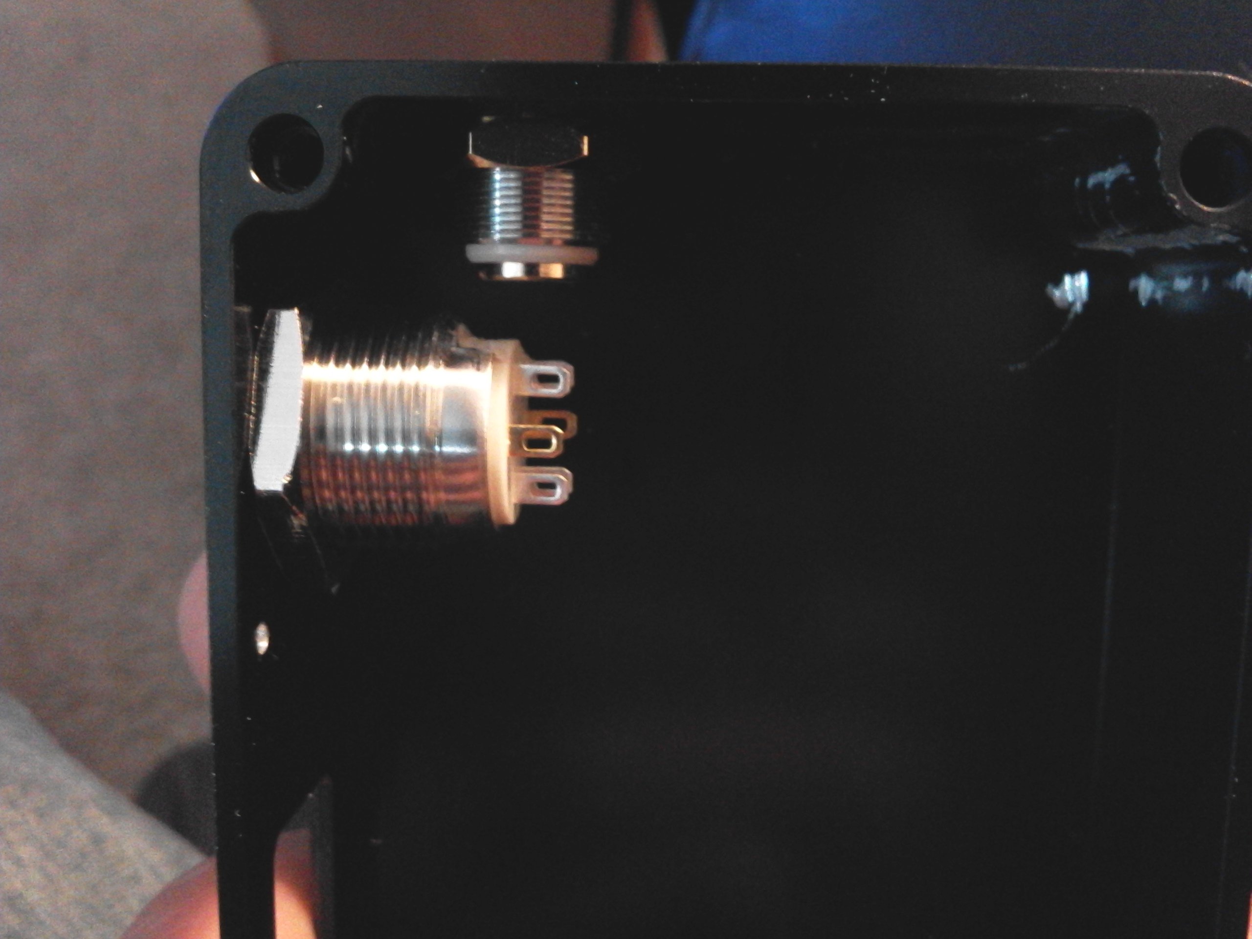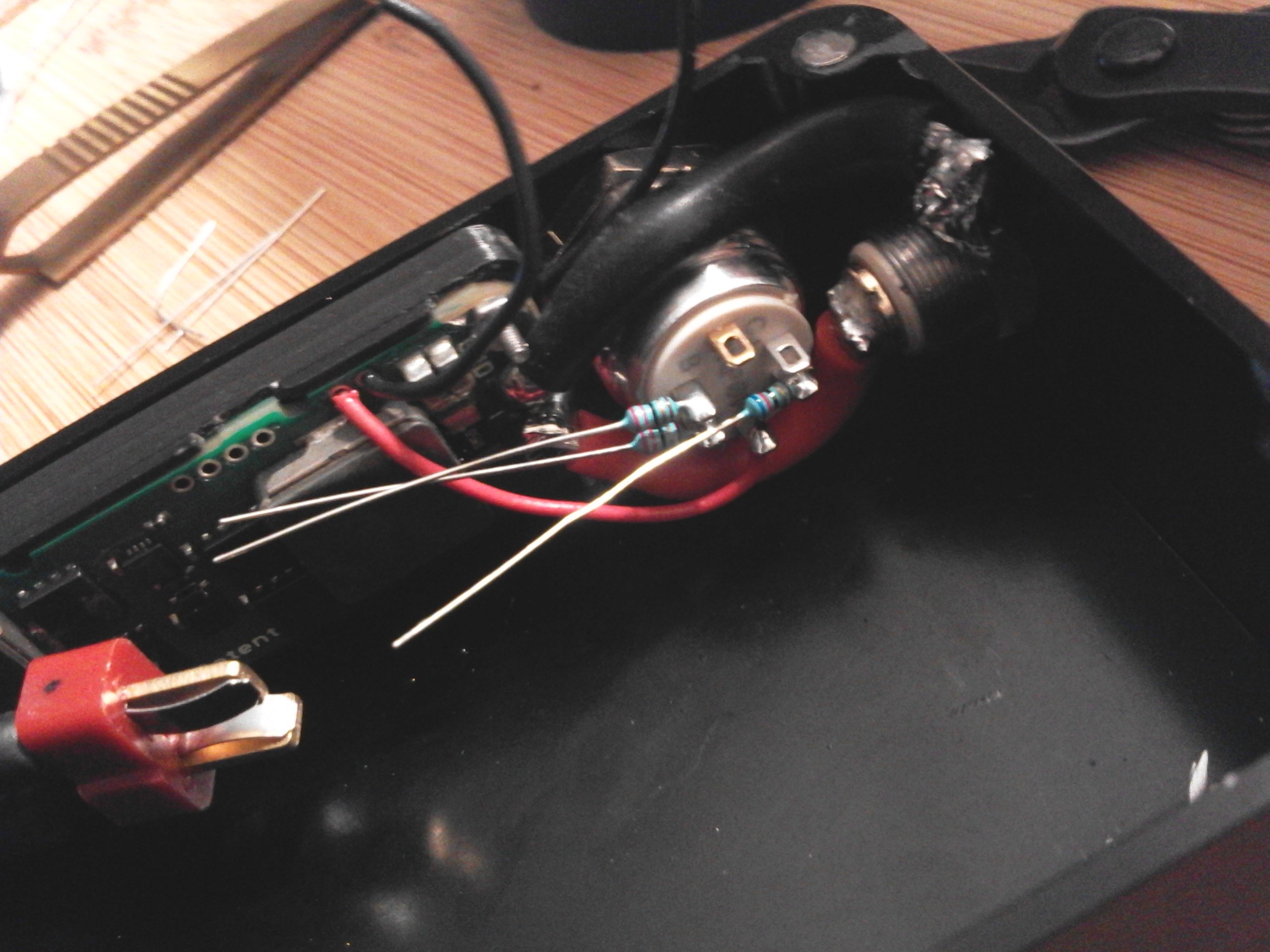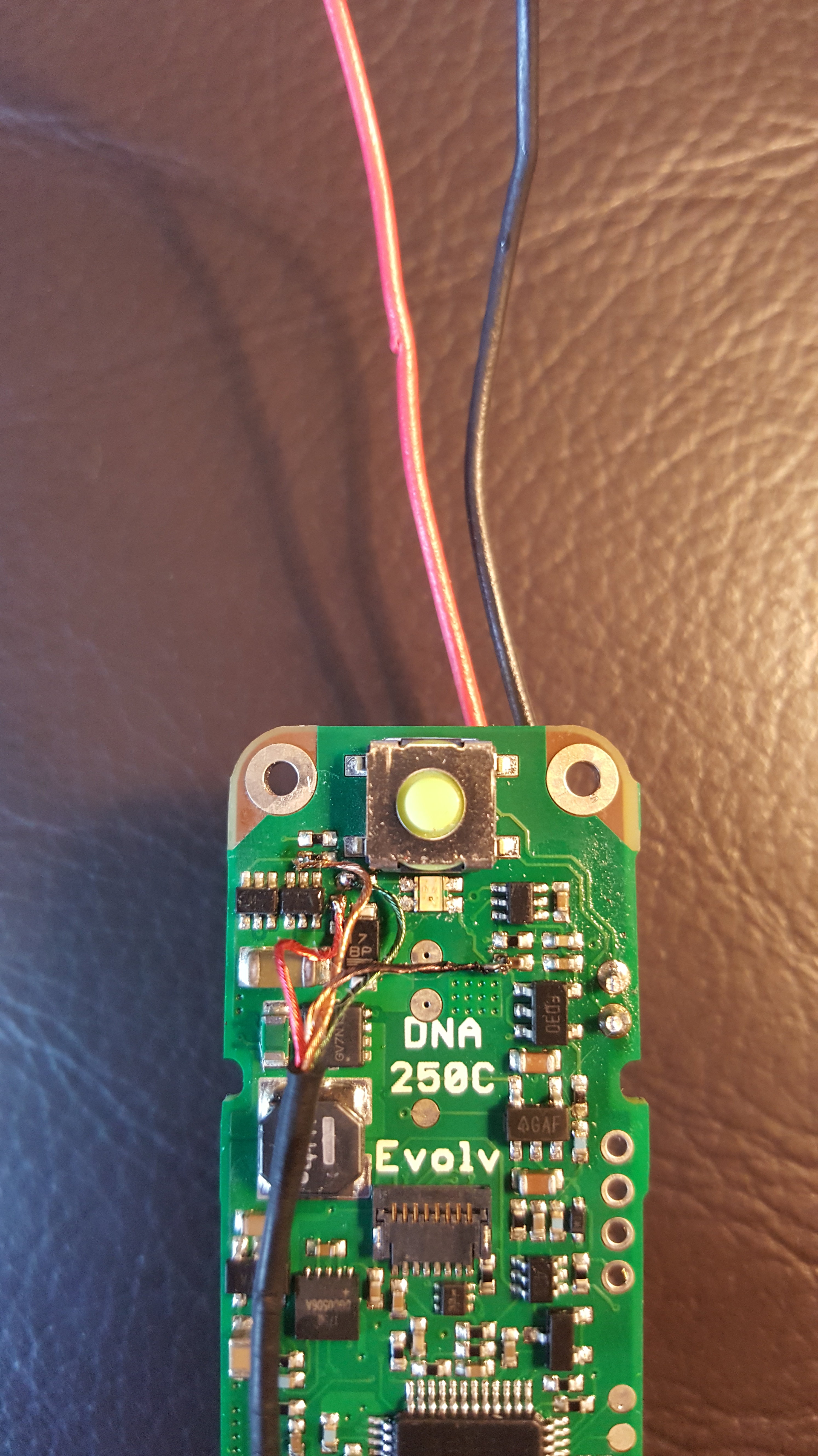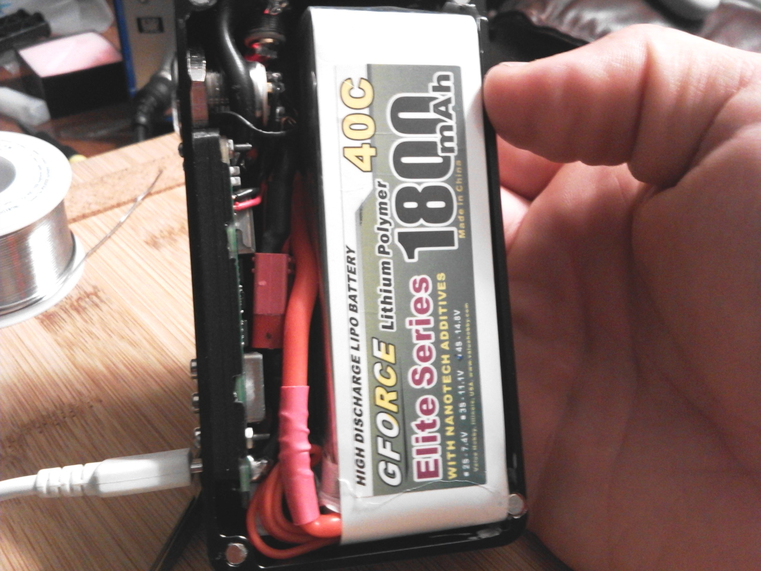 2. ATI B box ONPOW 16mm RGB momentary pushbutton (Common Anode, WITHOUT Resistor) GFORCE 1800 mAh 4s "Elite Series" 40C LiPo Varitube V2 510 Connection 12 AWG Silicone Wire (Battery and Output) "Deans" T-Connectors JST-PH Right Angle Balance Connector Custom JST-PH to JST-XH Adapter ...And LOTS OF DIE GRINDING!!!! I ground a 16mm cutout downward from the original 12mm CNC'd hole. Moving it as far as possible from the 510 without leaving a gap that wouldn't be covered by the switch bezel. However, there was still a clearance and shorting issue. So.... More grinding on the switch. I wanted the largest possible battery I could fit in the box, but that left concerns with the balance connector. I went with a right angle "PH" header on the board, and adapted that to the "XH" that comes standard on most batteries. I was already going big on this build and decided to push the limits running 12AWG wire throughout. (I know, beyond datasheet spec.... but I made it work.) Aluminum sinks heat very well, hence the ugly 510 ground. Just couldn't get things hot enough. I attached directly to the brass nut. Wiring the switch was tricky. ******************I don't recommend anyone try this unless you are VERY confident in your skills at soldering tiny points.****************** Black (ish) wire to the right is common positive (+) voltage (3.6v regulated). Gold/Copper wire is "blue" LED ground point. Red and Green wires are the ground points for their respective color. ***NOTE: Solder points are chosen to avoid using the onboard resistors. (ie. Attached to the side opposite the LED) I run my own "external" resistors at the switch... Resistor Values that I used: (A bit higher might be desired, since these values put the LED current beyond spec and a bit too bright, and probably affecting overall lifespan of the diode(s).) 62 ohm - RED 22 ohm - GREEN and BLUE And the battery ended up being larger than stated on the website by a mm or two in all directions, which required even more grinding to allow for clearance. Primarily on the lid. Not pretty, but necessary. But everything fit. Not much space remaining.... In case someone asks: Yes, I partially unwrapped the battery to slide the reinforcing shrink tube down the wire. I needed the additional bend radius.... I apologize for the quality of some pics. Build happened over numerous days, different lighting conditions, and a couple phones/cameras.