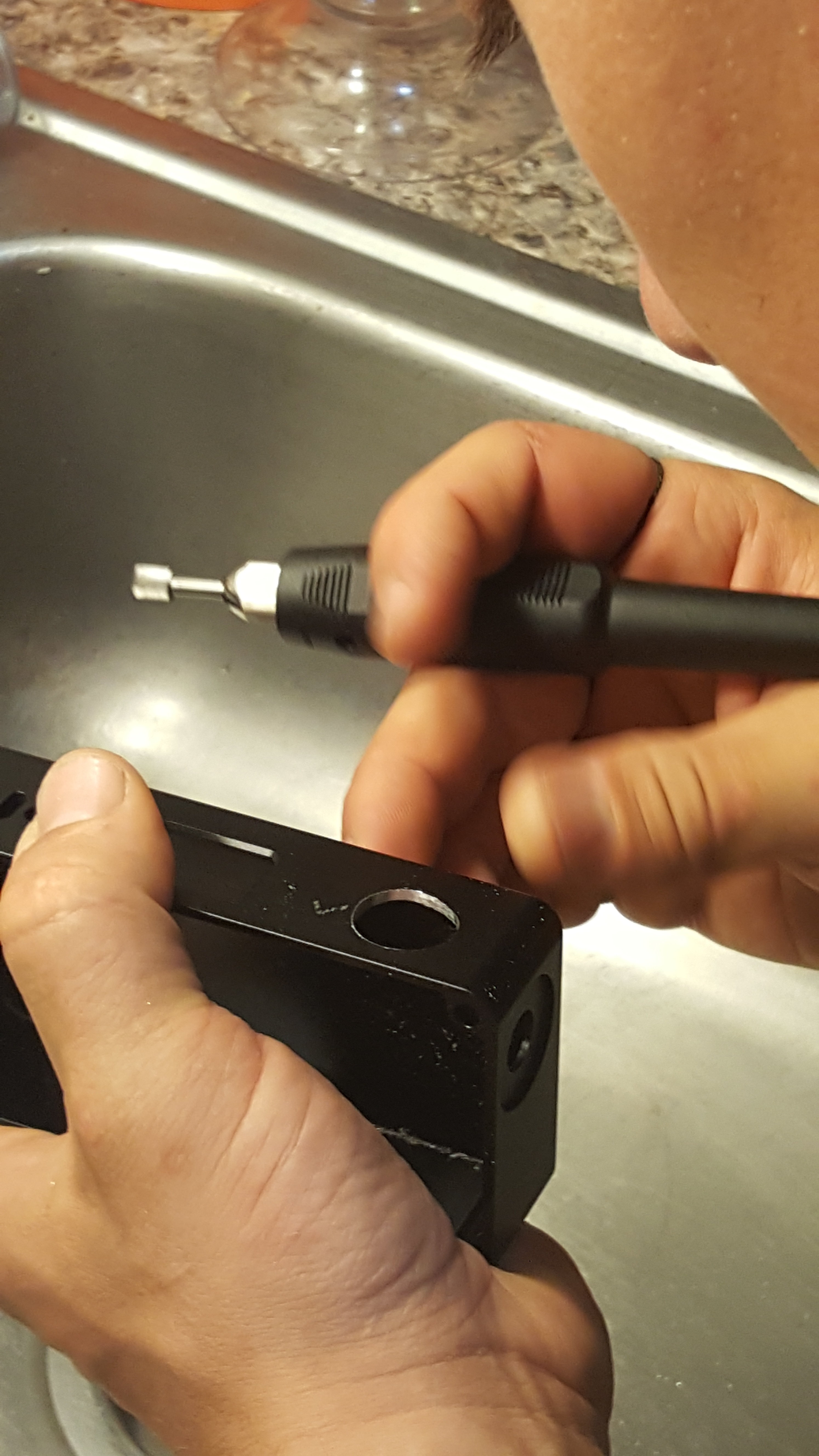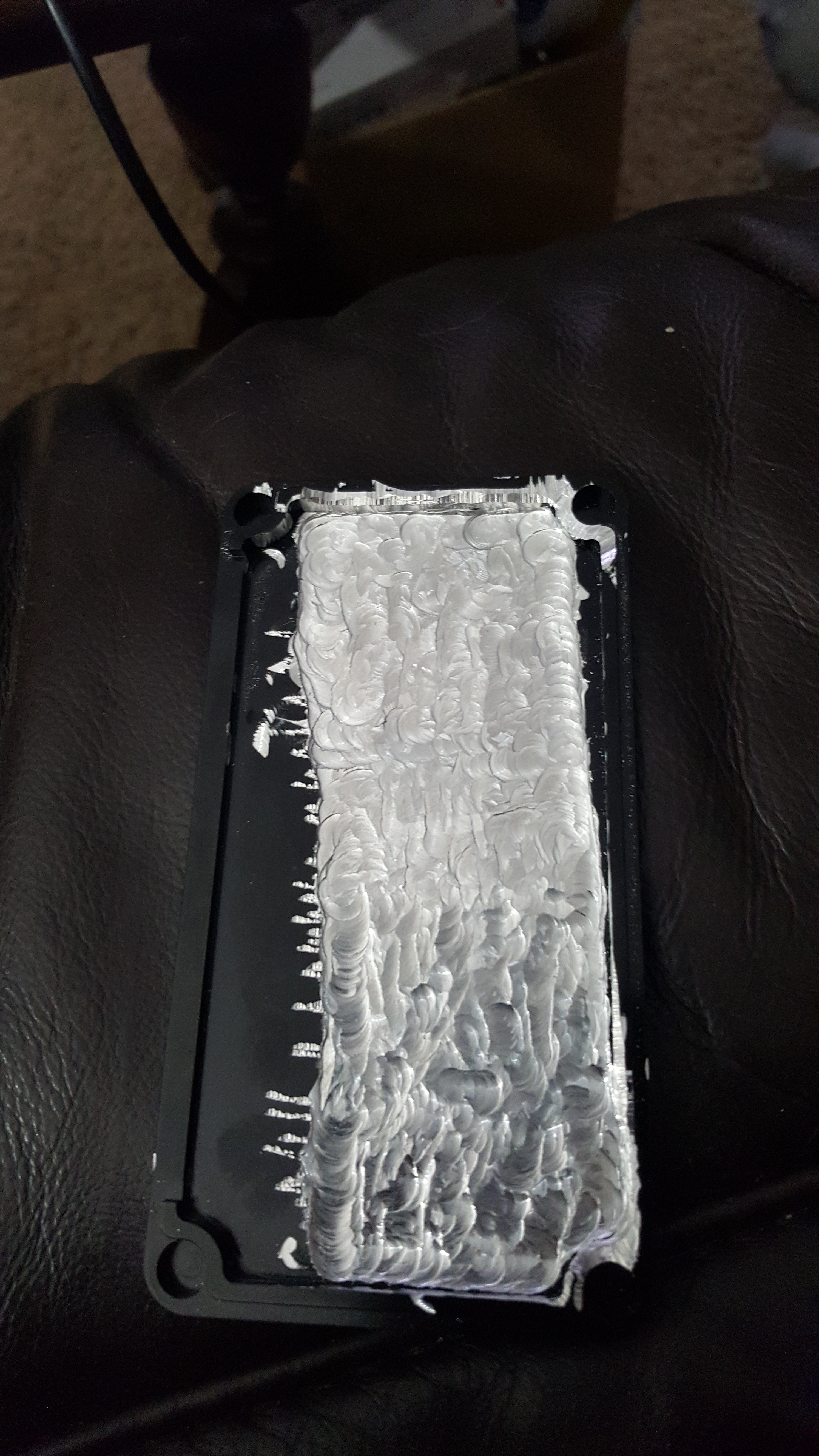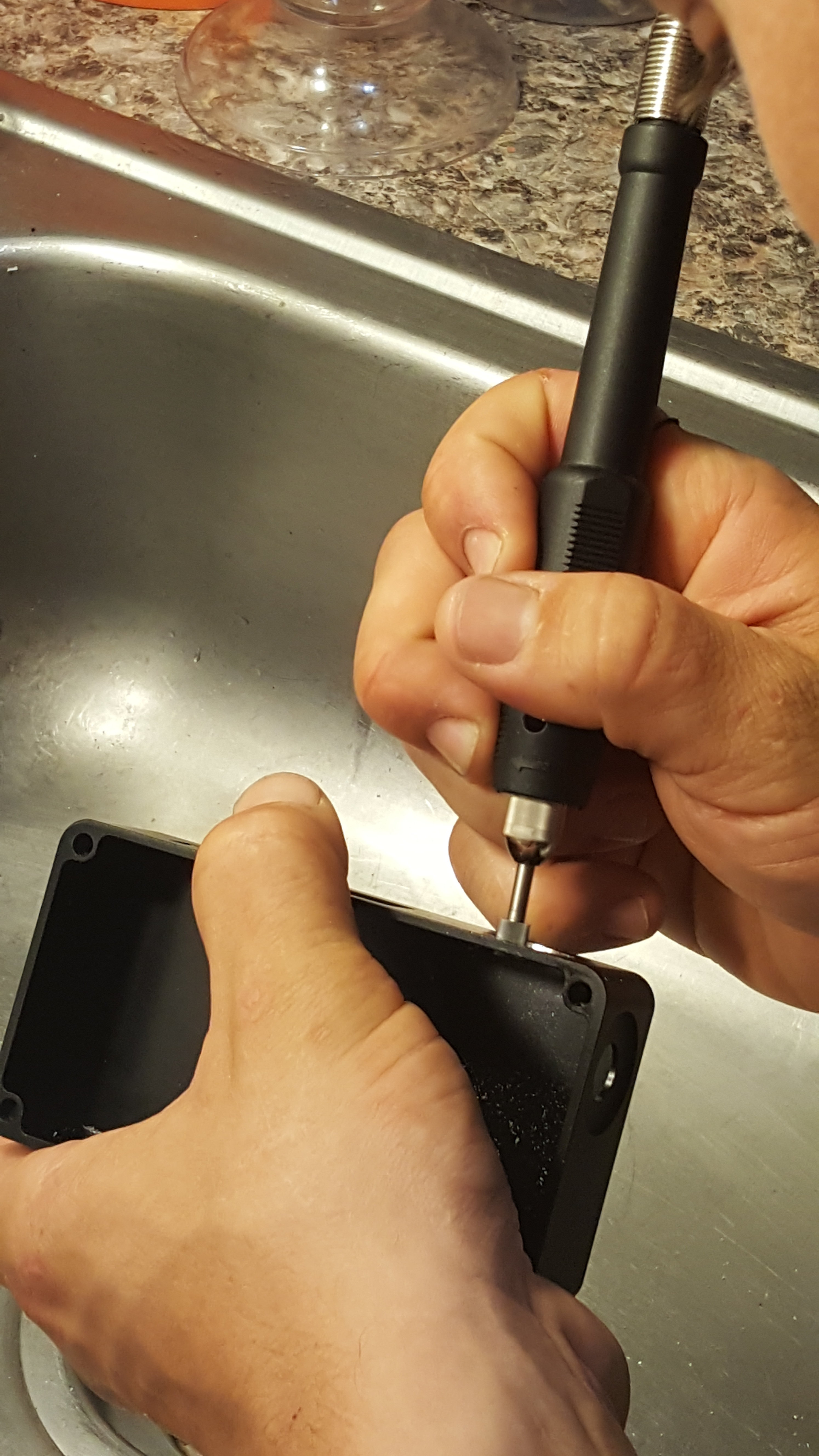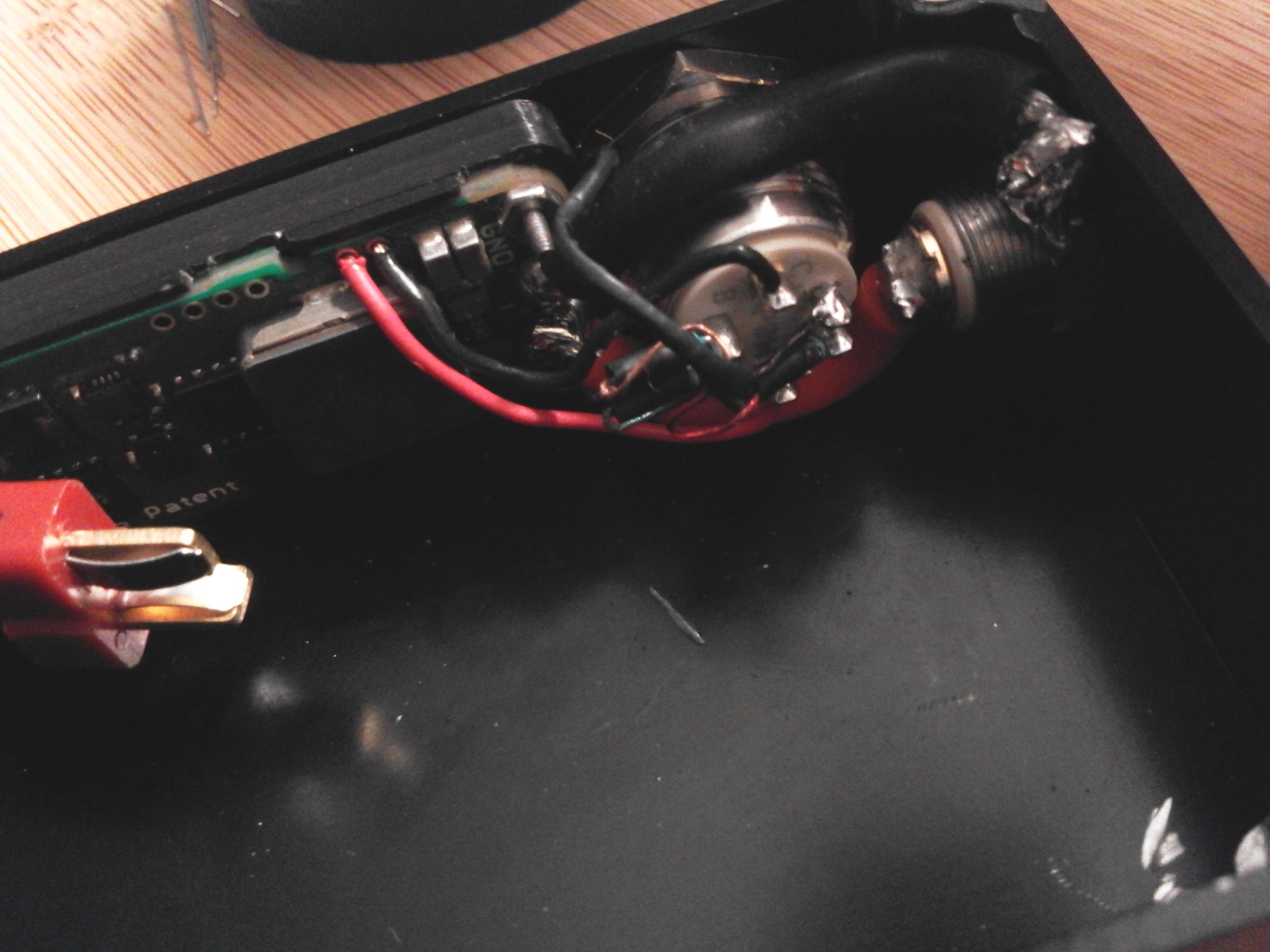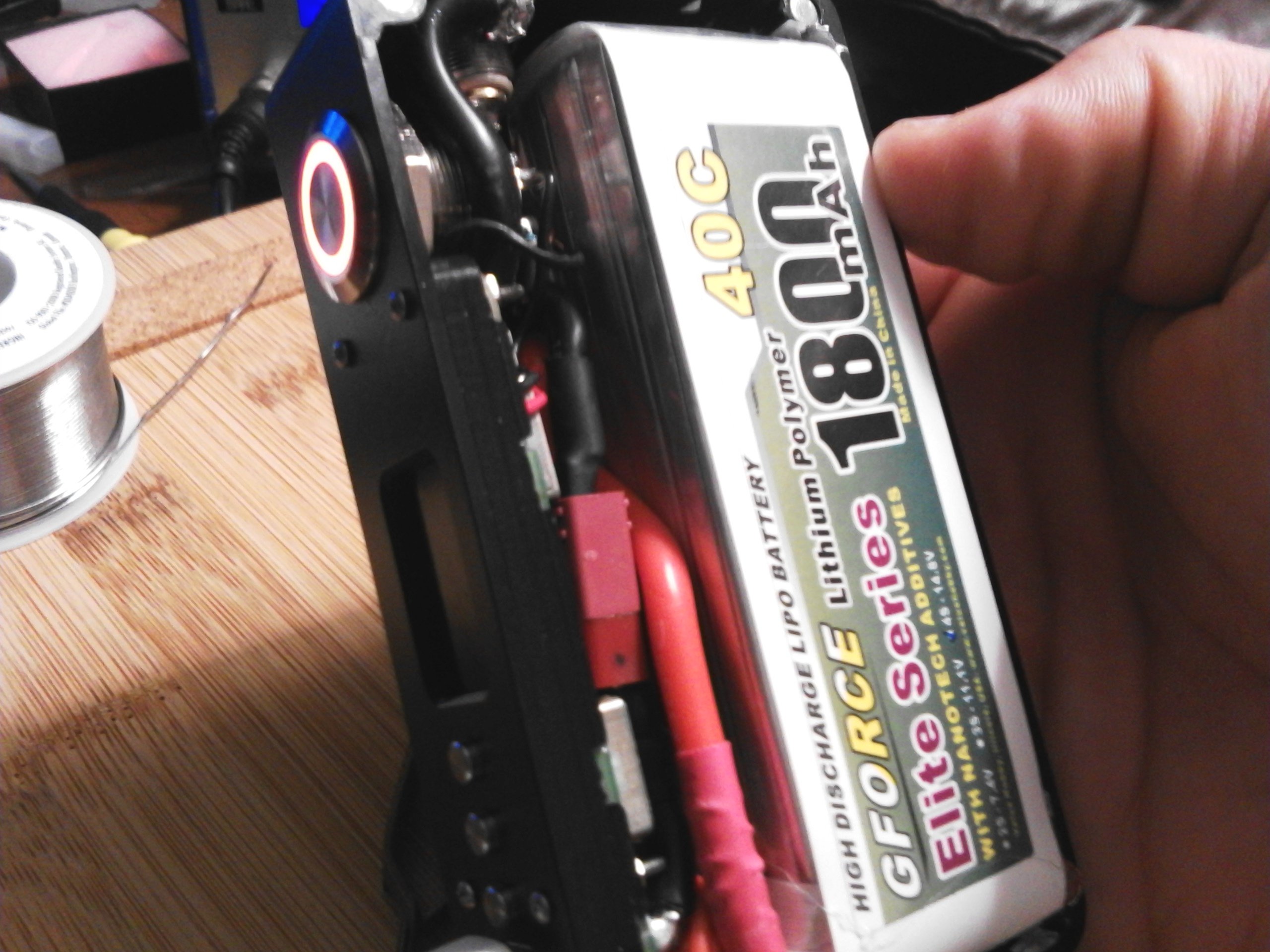 ATI B box ONPOW 16mm RGB momentary pushbutton (Common Anode, WITHOUT Resistor) GFORCE 1800 mAh 4s "Elite Series" 40C LiPo Varitube V2 510 Connection 12 AWG Silicone Wire (Battery and Output) "Deans" T-Connectors JST-PH Right Angle Balance Connector Custom JST-PH to JST-XH Adapter ...And LOTS OF DIE GRINDING!!!! I ground a 16mm cutout downward from the original 12mm CNC'd hole. Moving it as far as possible from the 510 without leaving a gap that wouldn't be covered by the switch bezel. However, there was still a clearance and shorting issue. So.... More grinding on the switch. I wanted the largest possible battery I could fit in the box, but that left concerns with the balance connector. I went with a right angle "PH" header on the board, and adapted that to the "XH" that comes standard on most batteries. I was already going big on this build and decided to push the limits running 12AWG wire throughout. (I know, beyond datasheet spec.... but I made it work.) Aluminum sinks heat very well, hence the ugly 510 ground. Just couldn't get things hot enough. I attached directly to the brass nut. Wiring the switch was tricky. ******************I don't recommend anyone try this unless you are VERY confident in your skills at soldering tiny points.****************** Black (ish) wire to the right is common positive (+) voltage (3.6v regulated). Gold/Copper wire is "blue" LED ground point. Red and Green wires are the ground points for their respective color. ***NOTE: Solder points are chosen to avoid using the onboard resistors. (ie. Attached to the side opposite the LED) I run my own "external" resistors at the switch... Resistor Values that I used: (A bit higher might be desired, since these values put the LED current beyond spec and a bit too bright, and probably affecting overall lifespan of the diode(s).) 62 ohm - RED 22 ohm - GREEN and BLUE And the battery ended up being larger than stated on the website by a mm or two in all directions, which required even more grinding to allow for clearance. Primarily on the lid. Not pretty, but necessary. But everything fit. Not much space remaining.... In case someone asks: Yes, I partially unwrapped the battery to slide the reinforcing shrink tube down the wire. I needed the additional bend radius.... I apologize for the quality of some pics. Build happened over numerous days, different lighting conditions, and a couple phones/cameras.