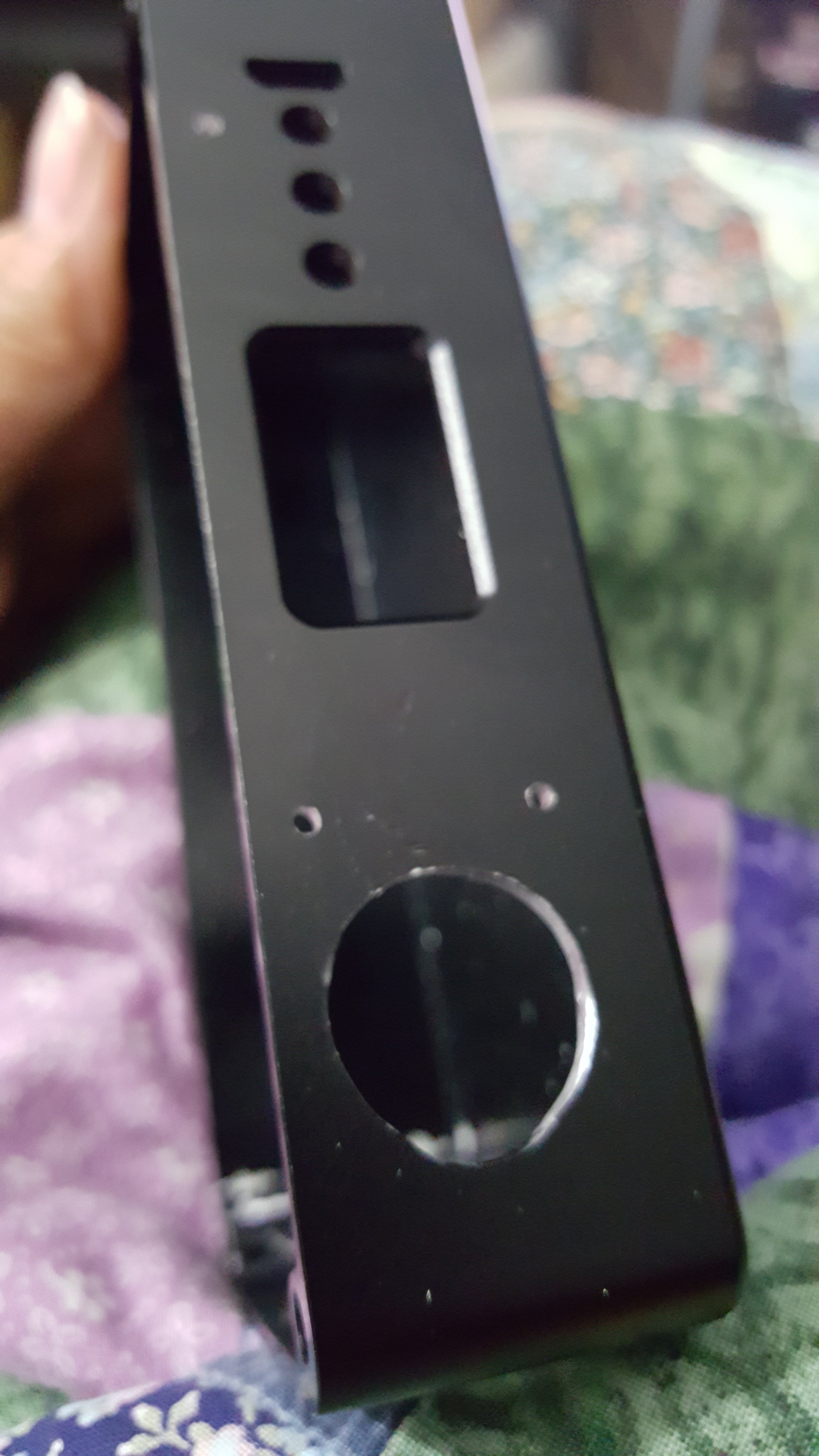 2. ATI B box ONPOW 16mm RGB momentary pushbutton (Common Anode, WITHOUT Resistor) GFORCE 1800 mAh 4s "Elite Series" 40C LiPo Varitube V2 510 Connection 12 AWG Silicone Wire (Battery and Output) "Deans" T-Connectors JST-PH Right Angle Balance Connector Custom JST-PH to JST-XH Adapter ...And LOTS OF DIE GRINDING!!!! I ground a 16mm cutout downward from the original 12mm CNC'd hole. Moving it as far as possible from the 510 without leaving a gap that wouldn't be covered by the switch bezel. However, there was still a clearance and shorting issue. So.... More grinding on the switch. I wanted the largest possible battery I could fit in the box, but that left concerns with the balance connector. I went with a right angle "PH" header on the board, and adapted that to the "XH" that comes standard on most batteries. I was already going big on this build and decided to push the limits running 12AWG wire throughout. (I know, beyond datasheet spec.... but I made it work.) Aluminum sinks heat very well, hence the ugly 510 ground. Just couldn't get things hot enough. I attached directly to the brass nut. Wiring the switch was tricky. ******************I don't recommend anyone try this unless you are VERY confident in your skills at soldering tiny points.****************** Black (ish) wire to the right is common positive (+) voltage (3.6v regulated). Gold/Copper wire is "blue" LED ground point. Red and Green wires are the ground points for their respective color. ***NOTE: Solder points are chosen to avoid using the onboard resistors. (ie. Attached to the side opposite the LED) I run my own "external" resistors at the switch... Resistor Values that I used: (A bit higher might be desired, since these values put the LED current beyond spec and a bit too bright, and probably affecting overall lifespan of the diode(s).) 62 ohm - RED 22 ohm - GREEN and BLUE And the battery ended up being larger than stated on the website by a mm or two in all directions, which required even more grinding to allow for clearance. Primarily on the lid. Not pretty, but necessary. But everything fit. Not much space remaining.... In case someone asks: Yes, I partially unwrapped the battery to slide the reinforcing shrink tube down the wire. I needed the additional bend radius.... I apologize for the quality of some pics. Build happened over numerous days, different lighting conditions, and a couple phones/cameras.