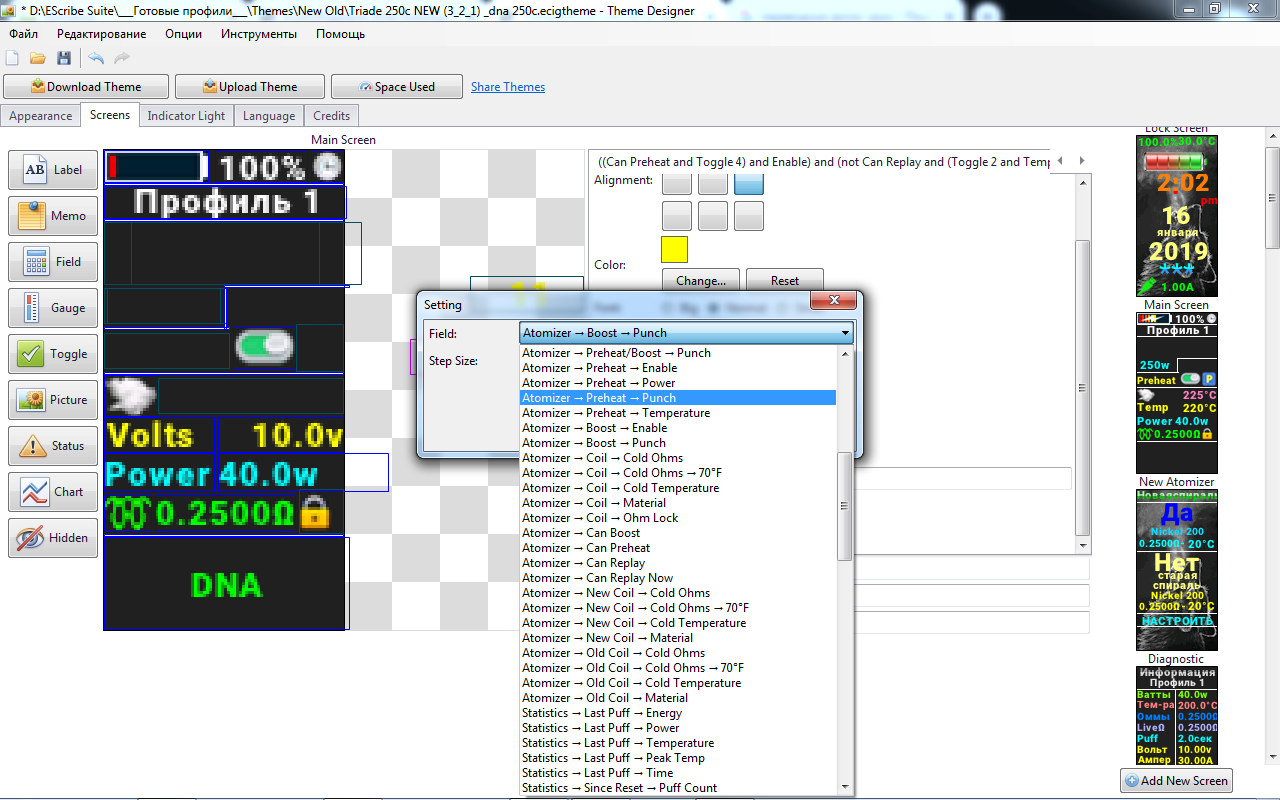 Очень интересный и необычный дизайн. Сразу скажу, что тема вполне функциональна и работоспособна,мне нравиться эта разработка, но дьявол в деталях! Мне кажется, что меню Preheat имеет большое количество недоработок (в разных режимах используются разные варианты предварительного нагрева Boost,Preheat by temperature, Preheat by power )у Вас я не вижу этих настроек. Для отображения напряжения ячеек, нужно увеличить Decimal places хотя бы до 3, это даст возможность более четко видеть реальную картину поведения батареи (плата балансирует напряжение ячеек с точностью до 0.001V). Похожая ситуация и с показаниями USB. Я бы добавил Fire from this screen на вкладке батарей и сопротивления. Я думаю, что при навигации может возникнуть конфликт при возврате из вкладки Main profile, по тому, что на эту вкладку есть перемещение из разных экранов (Menu page 1<> stats and profile). Удачи, это отличная работа!