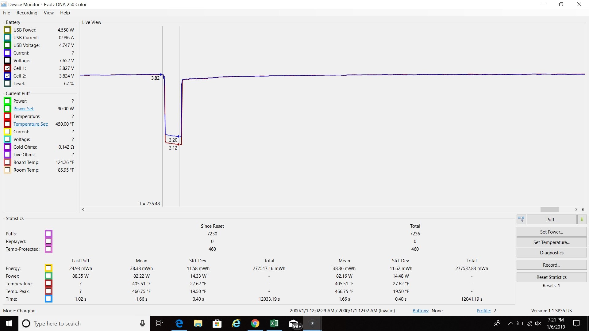 Hello! Back in April I ordered a Rebel dual 18650 squonk mod from eSauce. It arrived in May and I was ecstatic! This was my first venture into the worlds of both squonking and DNA chips, and I couldn't wait! I opened it, threw in a brand new pair of freshly charged Samsung 25Rs, filled the squonk bottle with my favorite juice, threw my Dead Rabbit RDA on, and nothing. It wasn't firing at all. After a bit of searching, I connected it to EScribe and found the chip to be programmed for a 4s LiPo battery vice dual 18650 batteries. This was super confusing, especially considering that "Each unit is hand finished and tested using extensive quality control techniques." I guess putting batteries in and a mod on top, then pressing the fire button doesn't fall into these "extensive quality control techniques." Anyway, I changed that and all was good, or so I thought. My battery life has always seemed extremely short to me. I finally sought assistance from the Electronic_Cigarette subreddit (https://www.reddit.com/r/electronic_cigarette/comments/abc1a8/dna_250c_weak_batterymassive_drain_on_dual_18650s/) and was reminded of this forum, along with getting some solid advice from u/Wayne0. I don't vape indoors, so I threw a build in an RDA that I wasn't using and dry fired it at the same settings I usually use while monitoring in Device Monitor. I have to admit, I was pretty surprised when I saw that I was consistently getting a 0.8 V sag, no matter the batteries I was using. I tried four different mated pairs, all while firing a 0.116 Ohm build at 90 W. At that resistance, there should be nowhere near that level of sagging. I cleaned all battery contacts and battery ends with isopropyl alcohol with absolutely no change. I cleaned the 510, as well. Still nothing. One screenshot from Device Monitor is attached, but I'm happy to provide more if interested. Great, not I get to take it apart and find the bad solder joints. After I got the board out, there was a weird rubber(?) coating covering all of the soldered connections. I can only guess this is to help with shorts, but it seemed excessive to me. Admittedly, I was (and still am) probably still just irritated at the whole situation and overreacting. Either way, once I got the coating off, I was pretty surprised by the solder job. I used my ceramic tweezers and very carefully removed the coating to ensure I didn't damage the board or the contacts at all, so what you see in the pictures is exactly how it left eSauce, sans a little rubber. While I can see what they were trying to do with the battery connections, it looks like they just pooled a bunch of solder around a few extra strands of wires to connect the sensing points. I get it, but it looks sloppy and lazy. This may be fine, and the resistance between the battery contacts and the back side of each corresponding contact on the board is 0.2 Ohm, so I guess it's functional. The biggest thing that caught my attention was where they soldered the 510 wires. Not only do the solder points look dry, but it looks like they burned the board. There is room in the mod for them to have soldered the wires going up, away from the board, instead of down and over the board, soldering at a weird and awkward downward angle to avoid interference. Now that the back story and rant is done, I think it's about time to begin desoldering, cleaning, and soldering in new wires in an attempt to fix my initial problem of having a 0.8 V sag when firing. I'll update with more pictures and results as I go. If you have any recommendations, complaints, or criticisms, I'm more than open to them. If I'm being stupid about any or all of this, also let me know. If you've had a similar experience, please feel free to vent. Looking around a little bit, mine is far from an isolated incident, but I didn't see any specific examples, just people alluding to others' experience with poor quality control with Rebel mods. I did consider sending it back to eSauce, but being in the US, I really don't feel like waiting for shipping to and from the UK. Thank you!