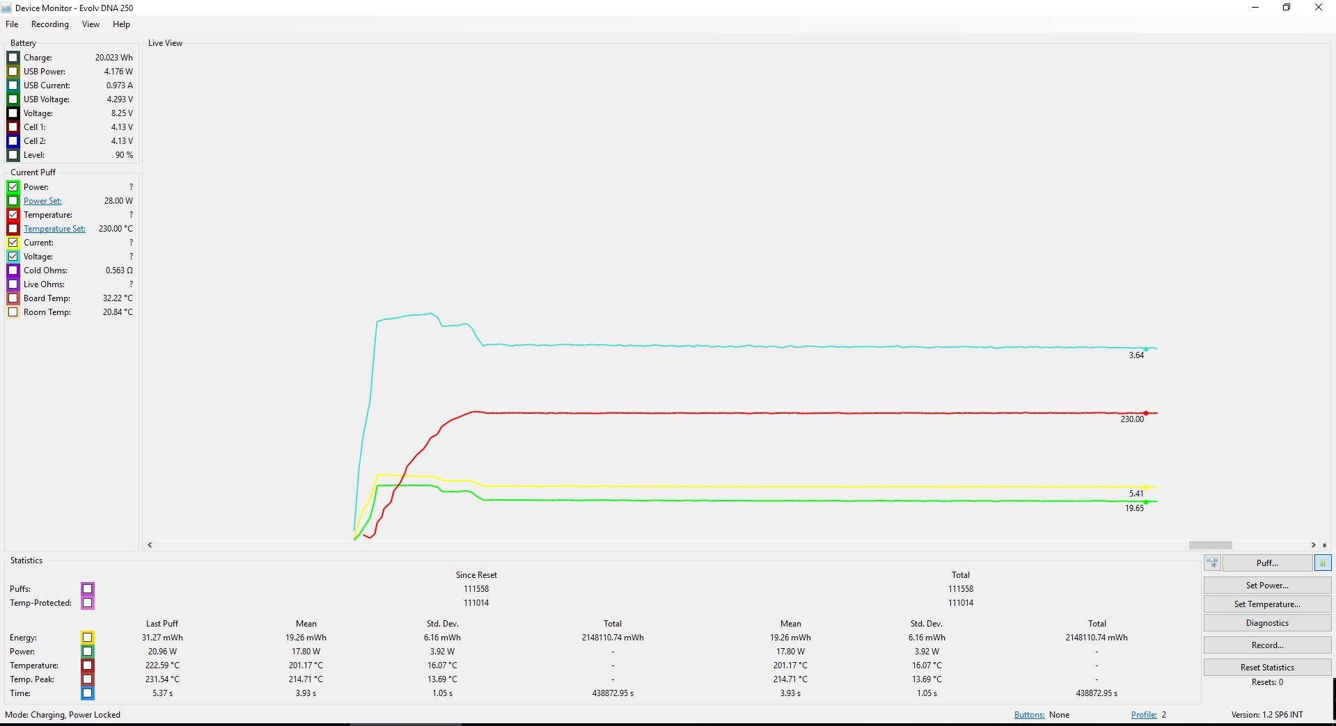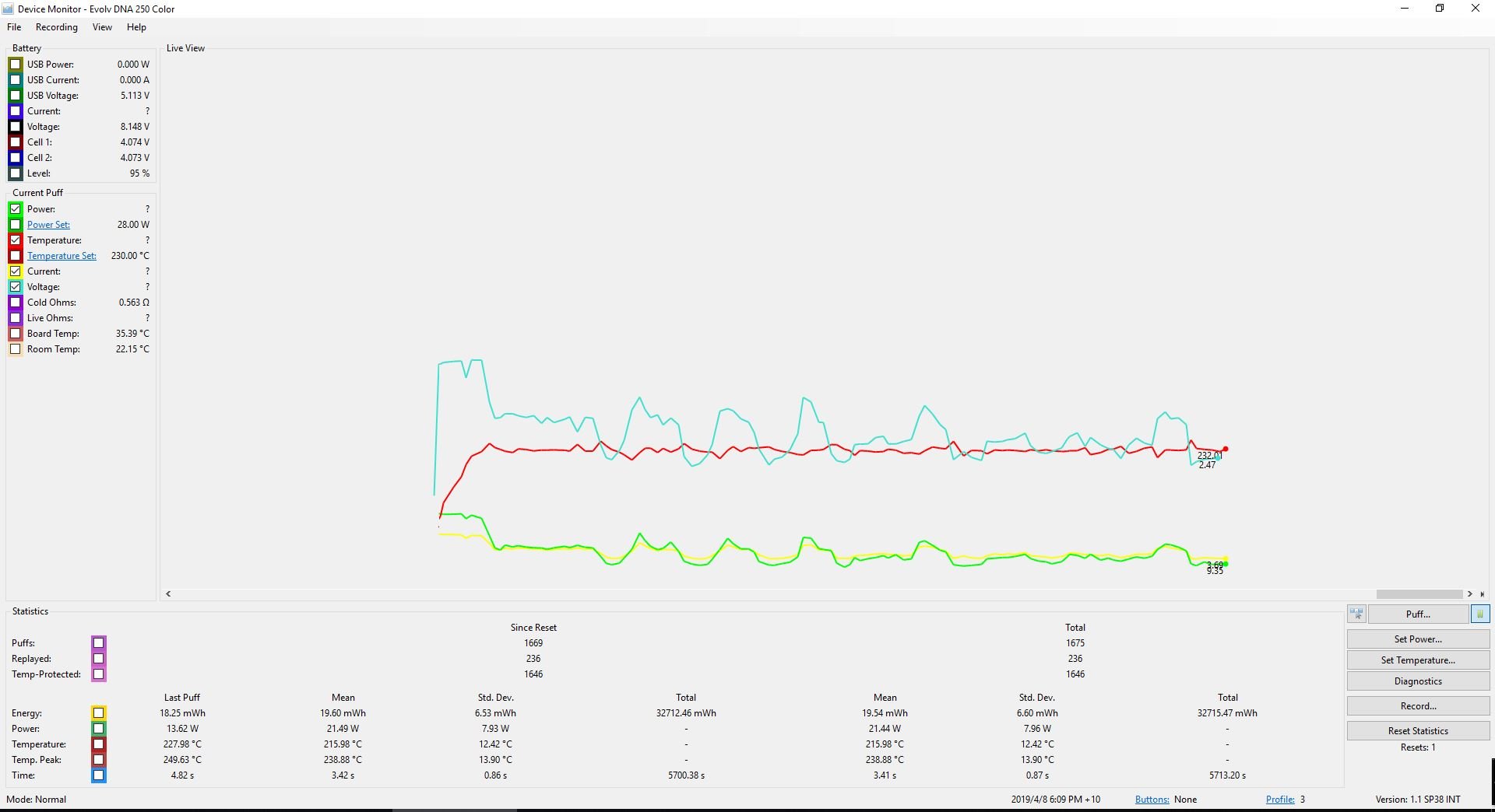 1. Hi There, I recently bought a DNA 250c, Unfortunately from the first use of the mod I have been experiencing throttling/instability using any of my atomizers. Here are two screen shots, one of my older DNA250 and of the new DNA250c. Both using the same RTA. Not using any punch or pre heat, it seems quite unstable compared to my old 250 using same settings and conditions. This is my 3rd DNA in three years and the other two were stable out of the box. 250: 250c: What do you guys think?