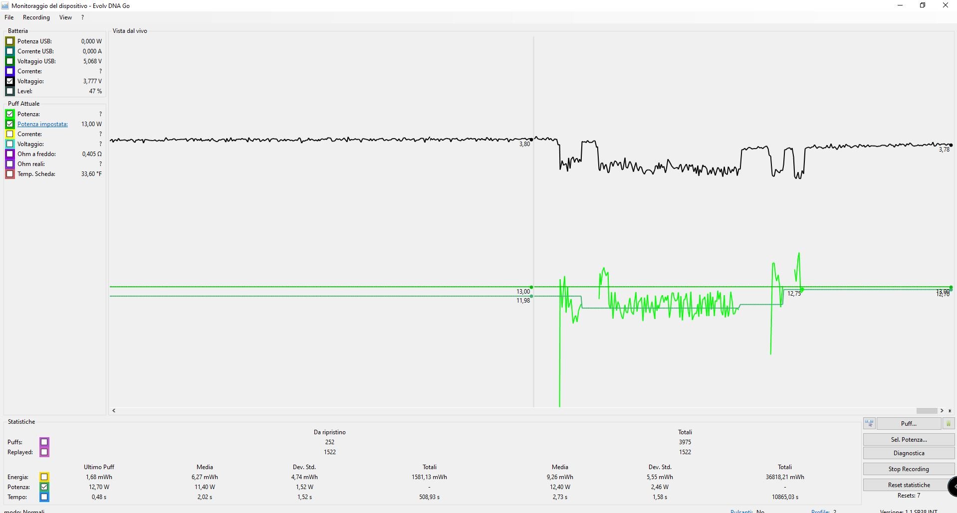 HI DWCRAIG 1 I attach csv file, I checked the batteries with the testet they are charged (they have a week of life) and I ticked the volt box, it never drops below 3.7 volts. I also cleaned the connector with alcohol and inside the card to make sure that everything is dry. If you set for example 16 watts, I get there in the graph for half a second, then it always stands at 10 watts on average, whatever power I set. I also tried with another good quality atomizer always with ss316 at 0.25 ohm and it is the same thing, the box does not want to push more than 10 watts. up to two days ago everything was fine, I thought about the liquid leaking from the atomizer, which went into the box, but I checked it well, everything is clean inside. maybe some sensor of the wet circuit? what can I do? I forgot to add that replay is logically disabled !!!! Thanks Values.csv