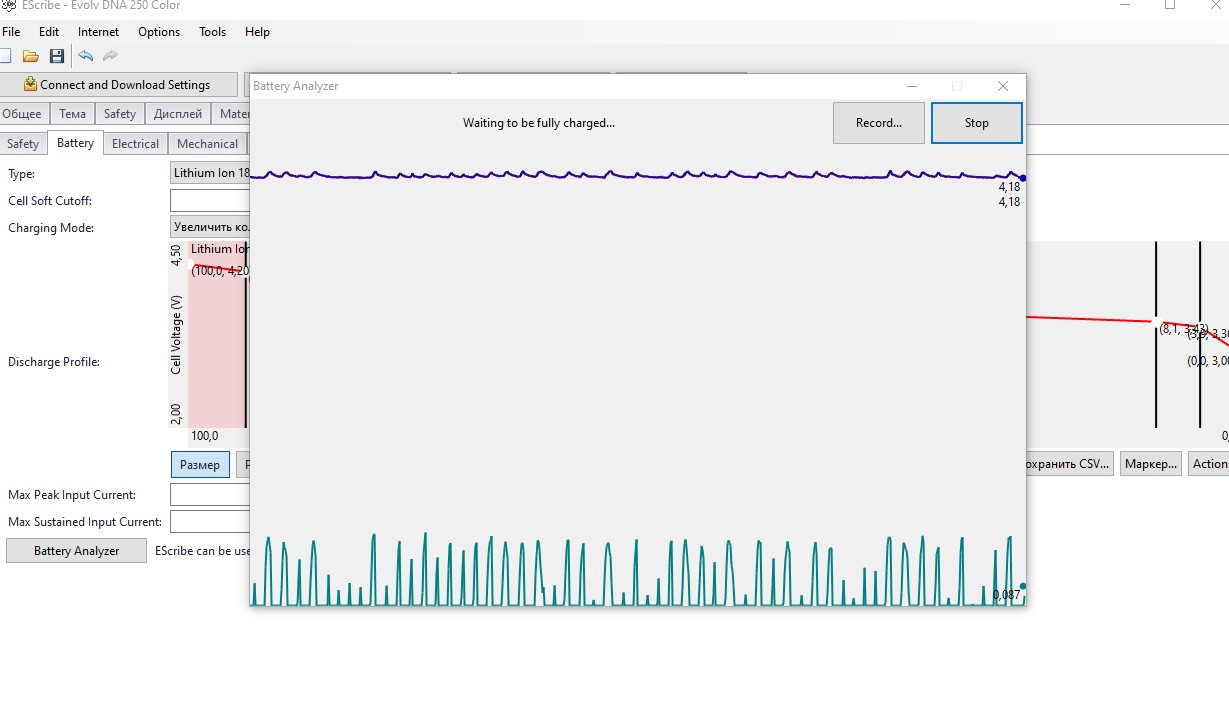 2. Good day. I have such a problem, DNA-250C cannot fully charge the batteries. I want to analyse the battery, but the program writes that I would wait for a full charge. I left it to charge overnight, and it did not reach 100%. I charged the batteries in an external charger, the device says it is 100% charged. EScribe doesn't want to run the battery test anyway. Batteries 2 cells (Sony vtc6) have been in use for about a year.