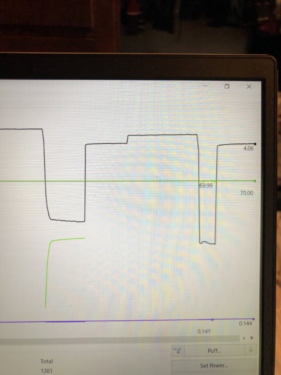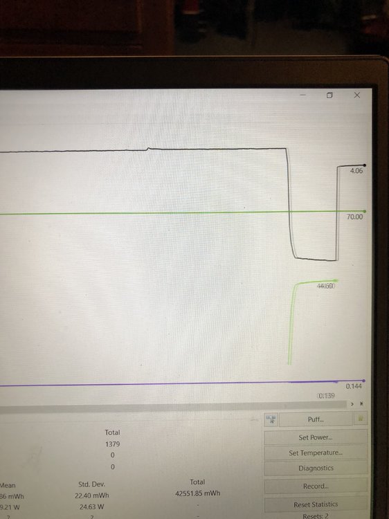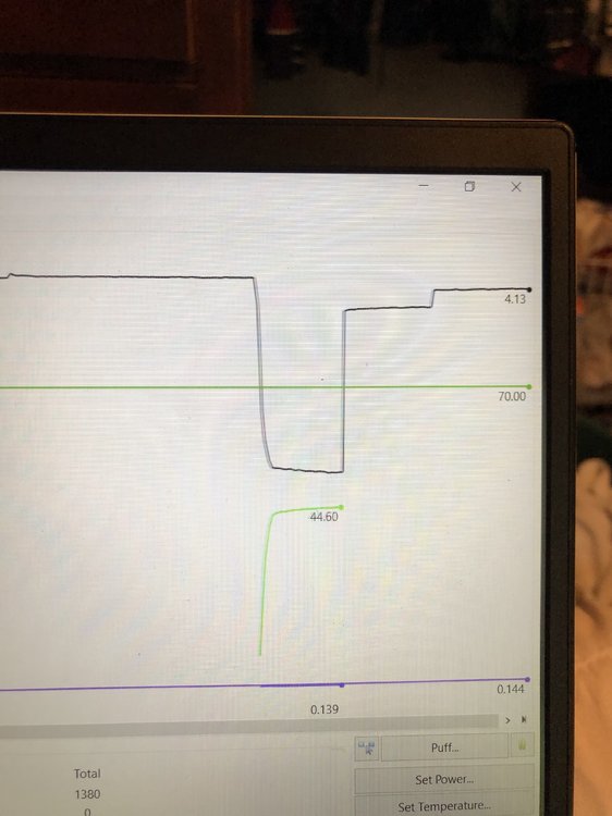 Okay so I’m this picture, I have a fully charged Samsung 40 t. The device is set on 80 watts. During a regular hit, it is hitting at 4.17 volts. Once the screen went black, it appears to be hitting at 46 watts, it also appears the volts went down. But after this, if I keep hitting it.. it still says upper 4 volts