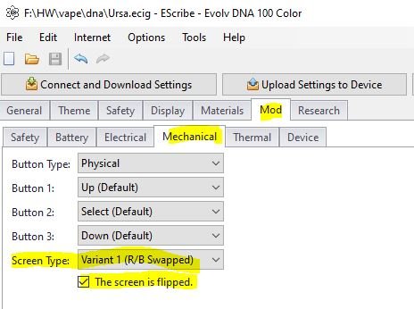 2. The Lost Vape Grus can be modified with a DNA75C Board, but the Ursa has the USB port in a lower position than the Grus. So I wondered if the DNA100C Board would fit into a Ursa. To make it short: it does Even the cables do not need any change as the soldering points are nearly 1:1 on the Ursa STM32 board and the DNA100C board. The original Ursa display can be used as well, it needs only 2 adjustments in ESribe: IMHO it is not worth the work as the Ursa STM32 board (Quest) can be flashed with Arctic Fox and get similar functionality than a DNA. But it is 100% doable 😜