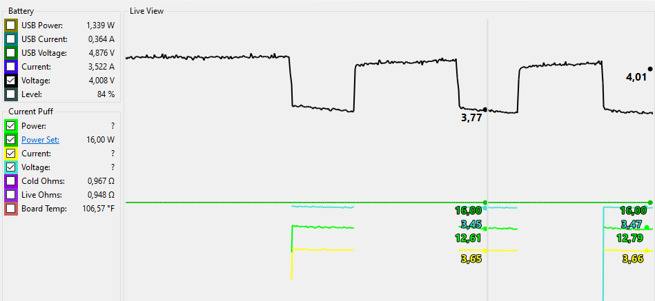 If I build to 1.7 ohms, it only outputs 7.7 watts instead of the desired 12 watts. If I use 0.9 ohms, the maximum output is 12.4 watts. Unfortunately, this is just not enough for a satisfying vaping experience.