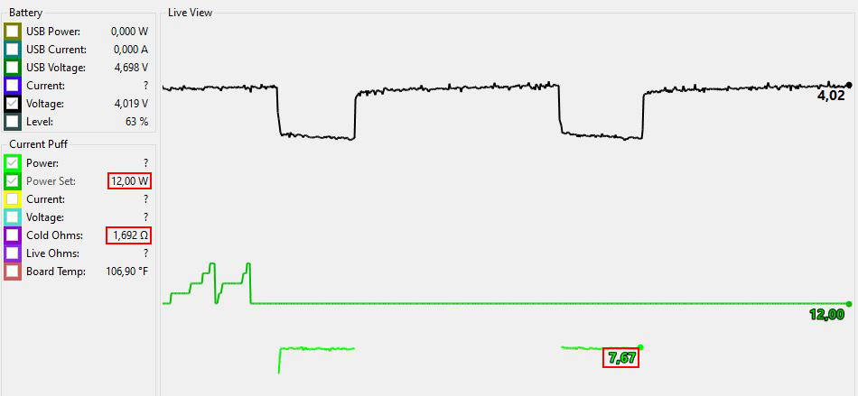 If I build to 1.7 ohms, it only outputs 7.7 watts instead of the desired 12 watts. If I use 0.9 ohms, the maximum output is 12.4 watts. Unfortunately, this is just not enough for a satisfying vaping experience.