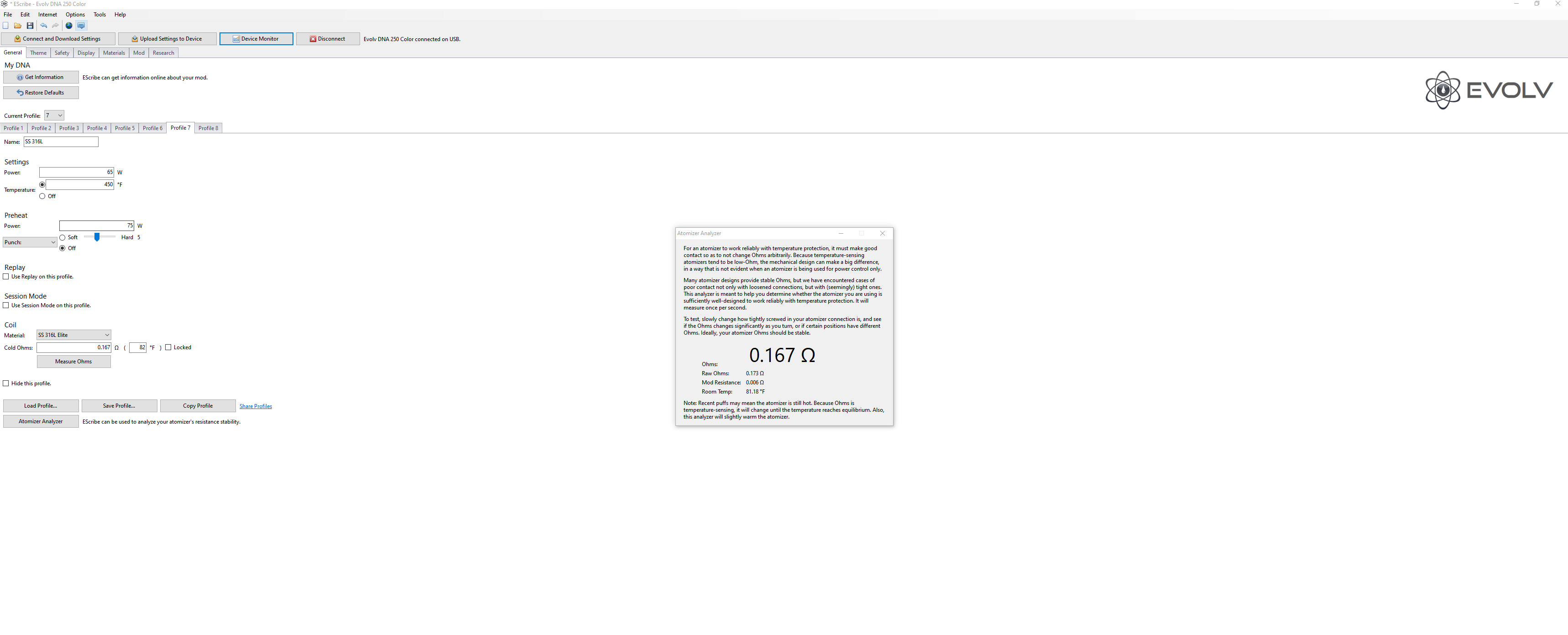 Hey Everyone, Been lurking long enough and went back and forth with support as well on how in the hell to make this Thelema and Wotofo Profile X work in TC mode properly. Had some successes mostly frustrations though. Figured I'd bring it up to the larger community and see if we can nail this one in hopes to also have it available easily for future people. Setup: Thelema 250c Wotofo Profile X (this ends up being the profile 1.5 coils/mesh) Wotofo SUS316L Coils (Ohms ~0.15) Using the stock 316 profile and downloaded a 316L profile from Steam Engine Done Case Analyzer correctly (which fixed the cold/ambient temp read a ton was off initially by +- 20 degrees, usually up) Already changed internal mod resistance from stock value of 0.004 to 0.006 (this was at the recommendation of support, lovely gentleman cause I would have told me to just give up and leave me alone) Have tried hard setting ohms, changing internal resistance to get to the ~0.15 ohms (usually reads about 2.2-2.4 above at the stock internal res of 0.004, Have it right now reading 0.166 stable no fluctuation with atomizer analyzer at 0.006 internal res, but vapor production is relatively non-existent until we get up to the 480+ range which just can't be right), but I haven't tried chucking it in a blender but I'm getting close. Whenever I get a cold reading its letting it cool, or when the coil is freshly bent to shape and inserted (so it hasn't been heated and should thus have a correct cold reading). Have had some luck a few times but not consistent enough to actually enjoy the beauty of TC yet. Adding images cause ya'll will ask for em