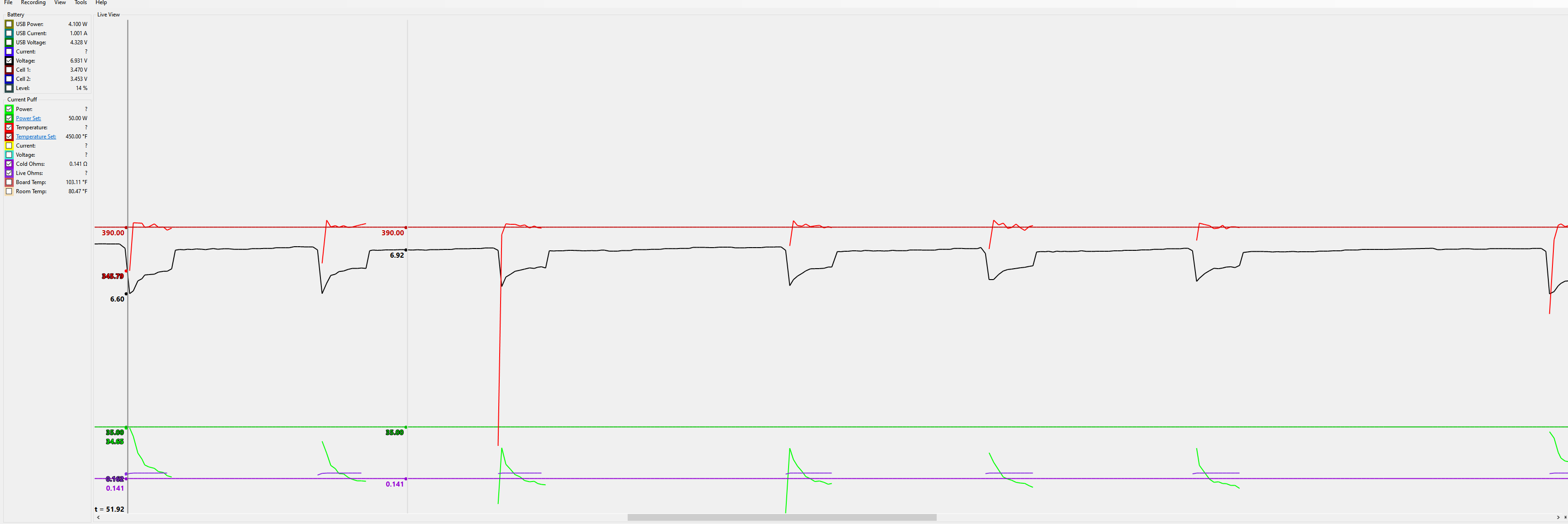 Yeah I've tried all the way down and like this. Found it as idea on another fourm where he called it out specifically on these Wotofo Mesh coils (although it was the original ones that were for the Profile 1 not the Profile 1.5 spec SUS316L coils I have. It will if I don't just keep hitting the puff command. That first one does on this screenshot. I'm not as much concerned on the "dread mesh dry hit" used to use the Profile PS with dual mesh and didn't like it when it happened but it didn't scar me for life either. Yeah its weird alright. Would figure the temp reading would start lower than it does. 2-3 secs in between puffs I understand won't come to room, but it doesn't drop much at all.