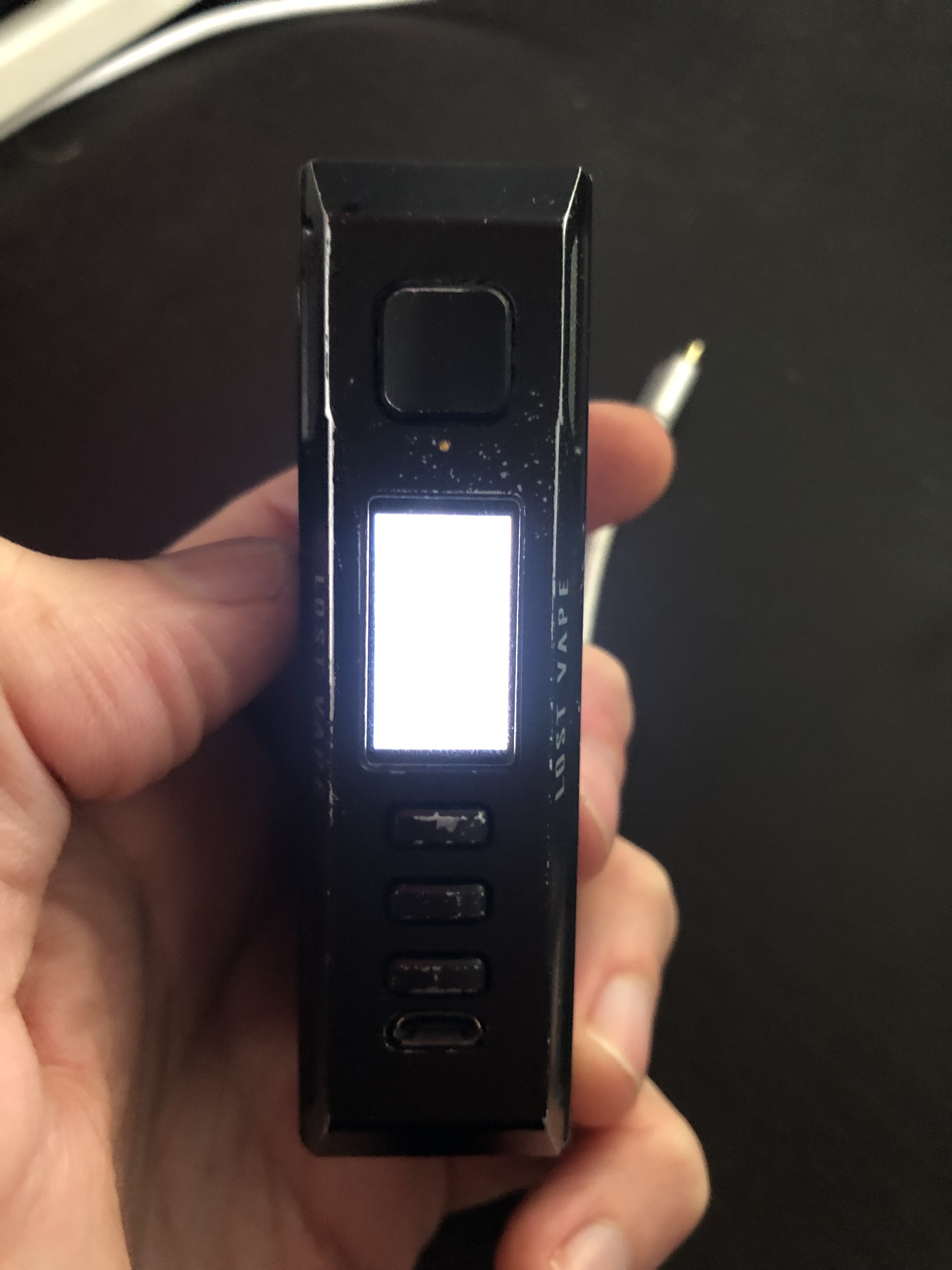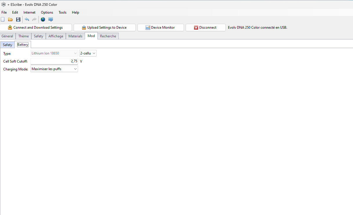 I had a strange bug for a few days with my LOST VAPE THELEMA DNA250C, I had it since 2 years, and no problem until these days. A charging symbol was permanently lit, but the box was not in charging mode. No consequences on the vape, but only on the percentage of battery, it remained stuck on a number, and descended by leaps from time to time. I'm on two 18650 batteries. Of course, I try different kind of set of batteries, I had multiples kind of it, LG ( brown ) , Efest ( purple ), but nothing changes. I tried to plug it in using the mini usb cable on the electrical outlet, but no lights came on. Charging was not working. I cleaned everything with Isopropylic alcohol. Then I removed the batteries, and simply connected to the computer to open it on Escribe.