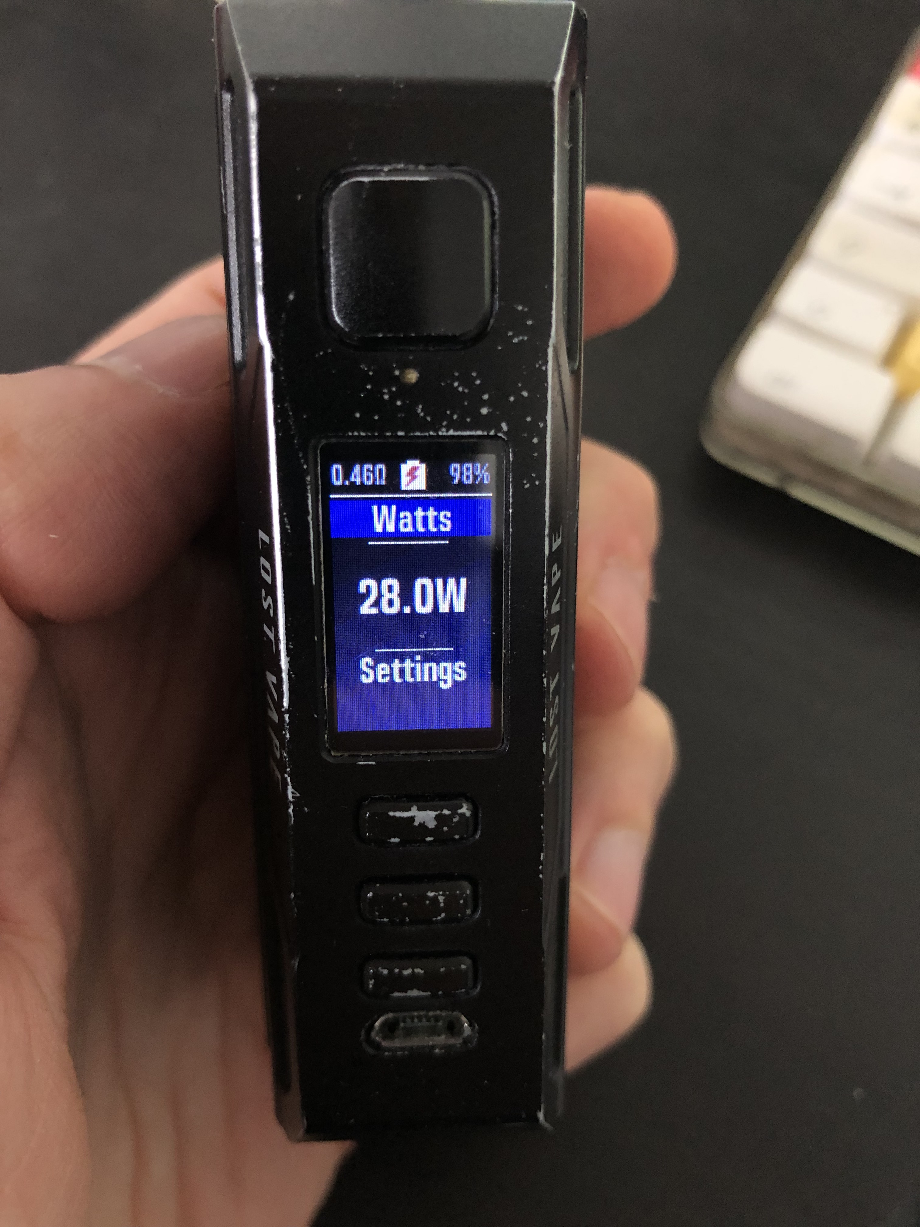 I had a strange bug for a few days with my LOST VAPE THELEMA DNA250C, I had it since 2 years, and no problem until these days. A charging symbol was permanently lit, but the box was not in charging mode. No consequences on the vape, but only on the percentage of battery, it remained stuck on a number, and descended by leaps from time to time. I'm on two 18650 batteries. Of course, I try different kind of set of batteries, I had multiples kind of it, LG ( brown ) , Efest ( purple ), but nothing changes. I tried to plug it in using the mini usb cable on the electrical outlet, but no lights came on. Charging was not working. I cleaned everything with Isopropylic alcohol. Then I removed the batteries, and simply connected to the computer to open it on Escribe.