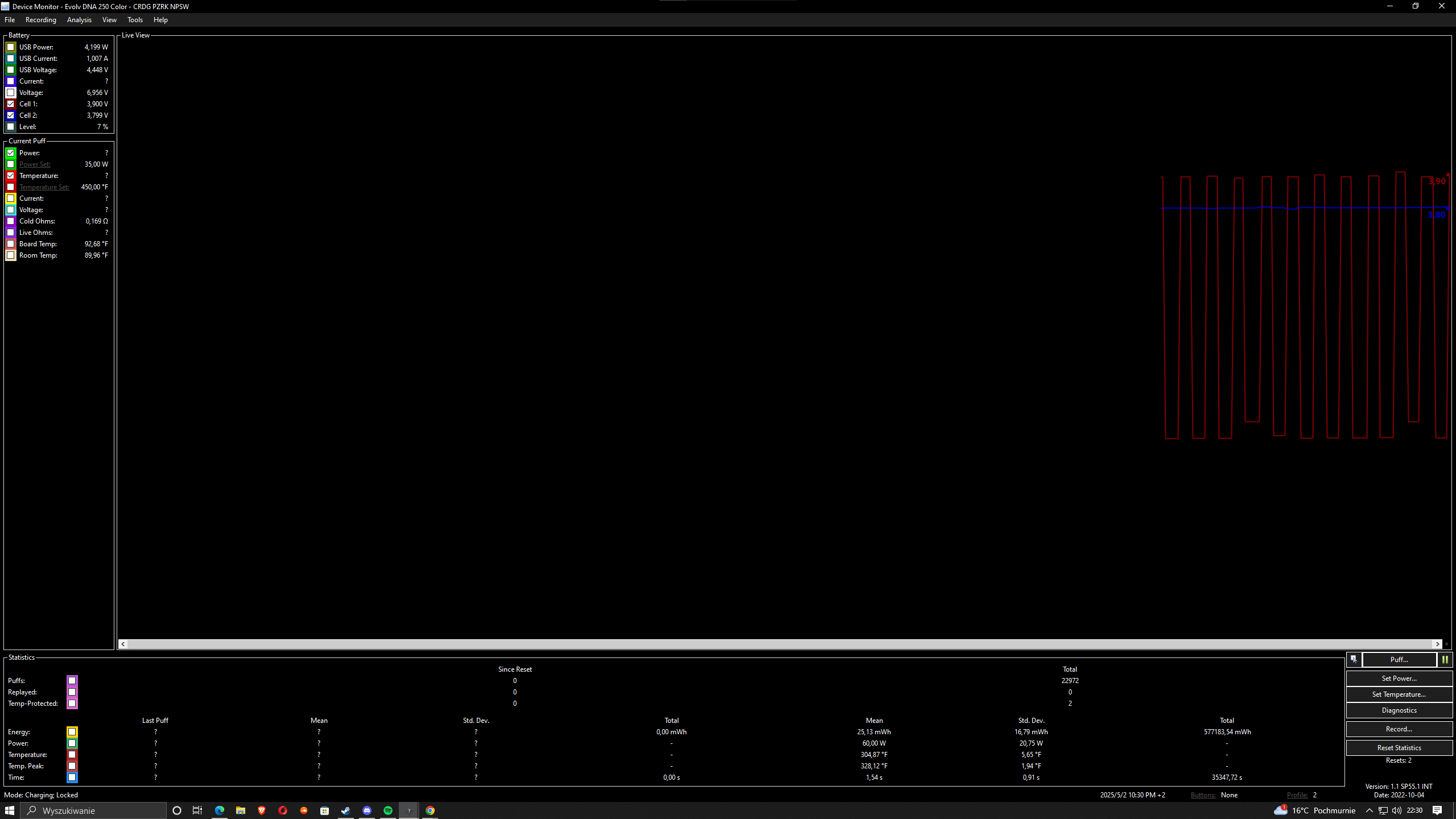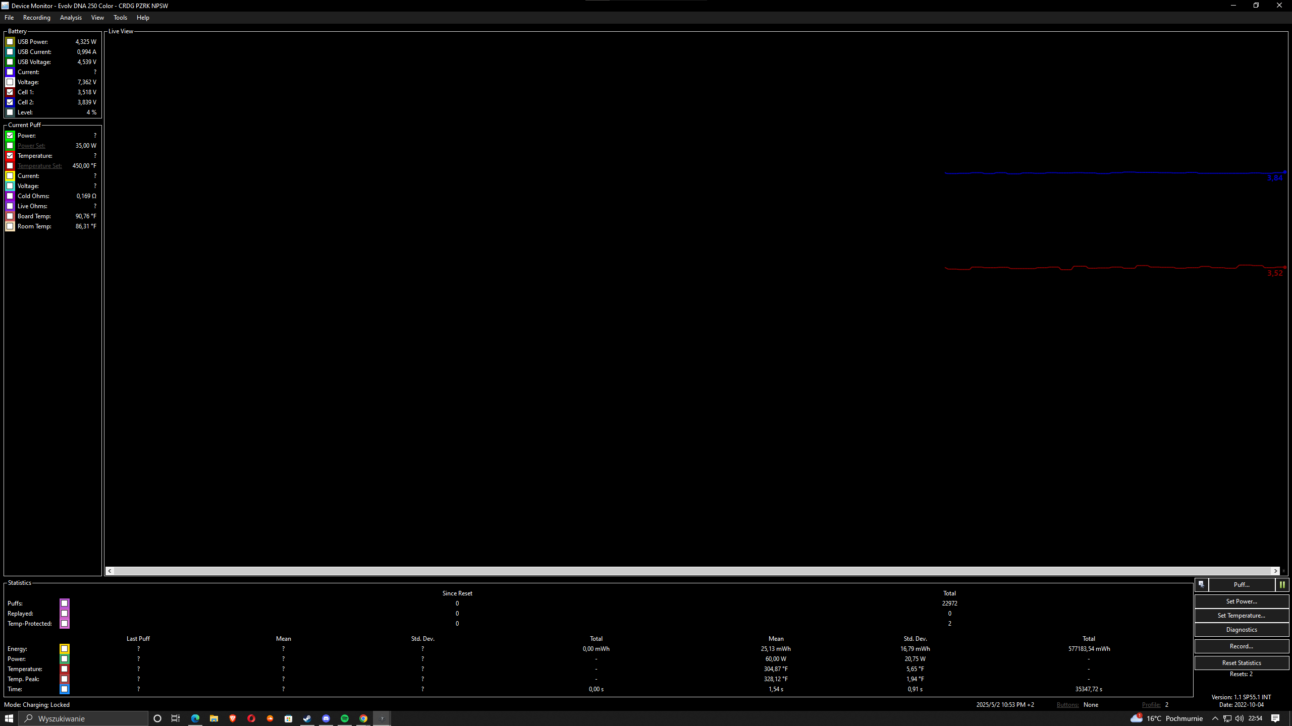 So after charging the batterys both are charged. When plugged it shows 93% after a reboot. While disconnected from the PC it shows 52%. The screenshot is made while taking a puff, While not pressing the power button the the cells are not jumping anymore. Any ideas why the battery % is going to 52% while disconnected? And if i don't fix it can it be dangerous?
