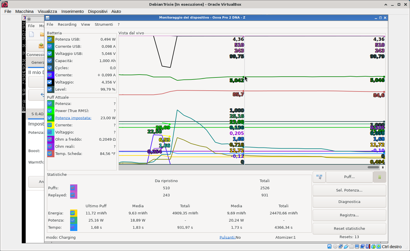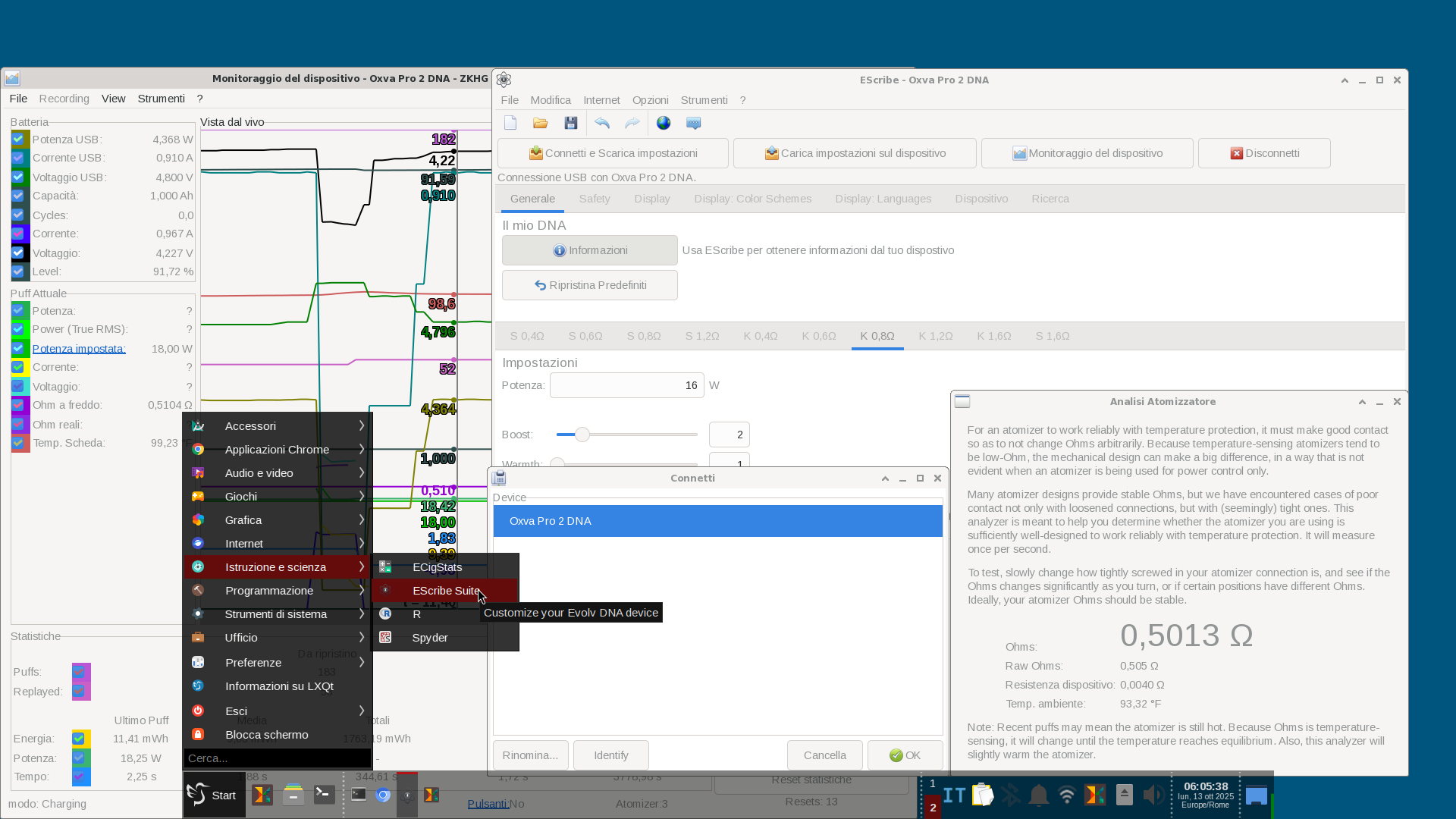 4. Thankyou for your great work James! Here is my Debian stable / trixie install $ uname -rms Linux 6.12.48+deb13-amd64 x86_64 $ cat /etc/debian_version 13.1 # apt install mono-complete $ mono --version Mono JIT compiler version 6.12.0.199 (tarball Thu Apr 3 15:13:01 UTC 2025) Copyright (C) 2002-2014 Novell, Inc, Xamarin Inc and Contributors. www.mono-project.com TLS: SIGSEGV: altstack Notifications: epoll Architecture: amd64 Disabled: none Misc: softdebug Interpreter: yes LLVM: supported, not enabled. Suspend: hybrid GC: sgen (concurrent by default) $ wget https://downloads.evolvapor.com/SetupEScribe2_SP71_INT.run $ chmod +x SetupEScribe2_SP71_INT.run $ ./SetupEScribe2_SP71_INT.run (It complains about gtk-3-0 not found but installation completes succesfully) > > > Connect E-Cig to USb port $ usb-devices P: Vendor=268b ProdID=043a Rev=01.01 S: Manufacturer=Dimension Engineering S: Product=Oxva Pro 2 DNA Diagnostic information: Firmware Version: 1.1 SP130.1 INT Firmware Date: 2025-09-25 Revision Code: 311113088 It works like a charm on my lenovo ThinkPad T420 🙂 Alessandro