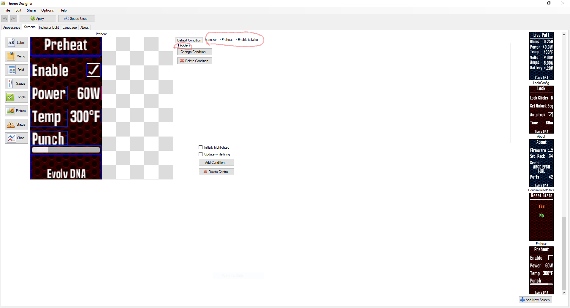 VapingBad Posted May 5, 2017 Author Report Posted May 5, 2017 In the photos the 1st is when preheat is on, 2nd is preheat off, 3rd is dropped out of temp protection. 4th is TP-enabled=false, 5th is TS-Material=false. This is how the conditions are set: The TP icon: default shows on image, atty\temp-protect-enabled=false as the condition for showing the off image. atty\temp-sensing-material=false also for showing the off image. Text status default shows "PH" for preheat atty\preheat-enabled=false shows "---" atty\temp-protect-enabled=false shows "PWR" in yellow atty\temp-sensing-material=false shows "PWR"in yellow atty\temp-sensing-dectect=false shows "???" in orange (tested with an ss coil using a NI profile) Temp Field atty\temp as default atty\temp-protect-enabled=false shows diag\atty\voltage atty\temp-sensing-material=false shows diag\atty\voltage