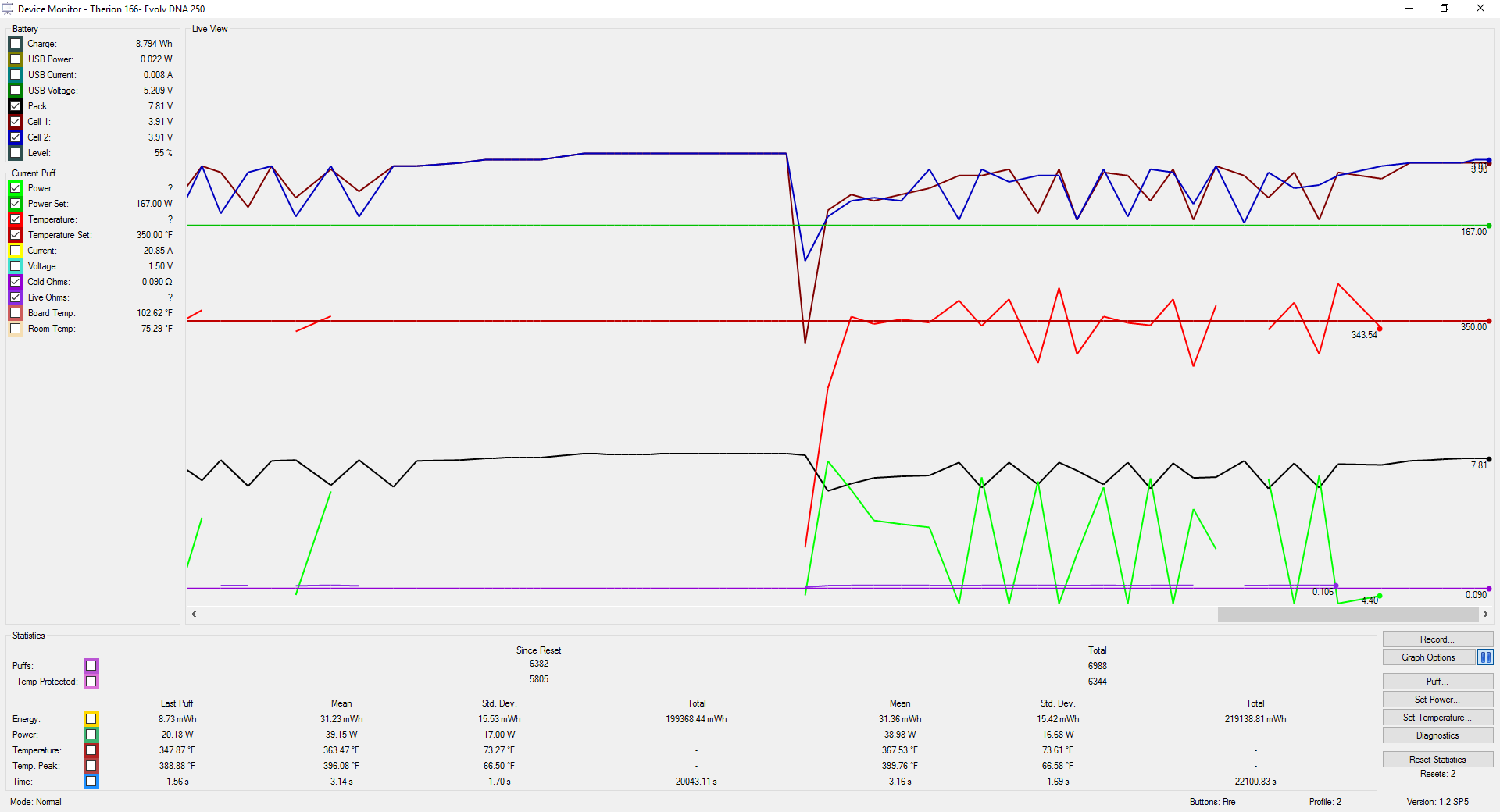 giz_60 Posted January 24, 2017 Author Report Posted January 24, 2017 Hey guys...have noticed a few times that I could feel the pulsing of the device & temp rising & falling. Was finally able to catch it on Device Monitor. Seemed like every time I tried before, it would clear up. This is on a Therion 166, 250 chip, SC Aromamizer, dual coil, 24g, 316L, about 6 or 7 wraps & clocking in at .09 ohms. In the screenshots attached, you can see the fluctuation when at 350F, but when I cranked it up to 375F, the fluctuation stopped. The third screenshot shows when I cranked it up to 375F. Every thing bounced around with it except for the cold & live ohms. Atomizer analyzer showing stable build. Checked all connections, etc... Any ideas?Edit...It has happened on different atty's as well, not just this one