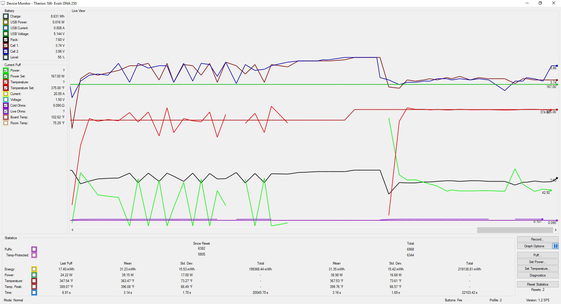 giz_60 Posted January 24, 2017 Author Report Posted January 24, 2017 Hey guys...have noticed a few times that I could feel the pulsing of the device & temp rising & falling. Was finally able to catch it on Device Monitor. Seemed like every time I tried before, it would clear up. This is on a Therion 166, 250 chip, SC Aromamizer, dual coil, 24g, 316L, about 6 or 7 wraps & clocking in at .09 ohms. In the screenshots attached, you can see the fluctuation when at 350F, but when I cranked it up to 375F, the fluctuation stopped. The third screenshot shows when I cranked it up to 375F. Every thing bounced around with it except for the cold & live ohms. Atomizer analyzer showing stable build. Checked all connections, etc... Any ideas?Edit...It has happened on different atty's as well, not just this one