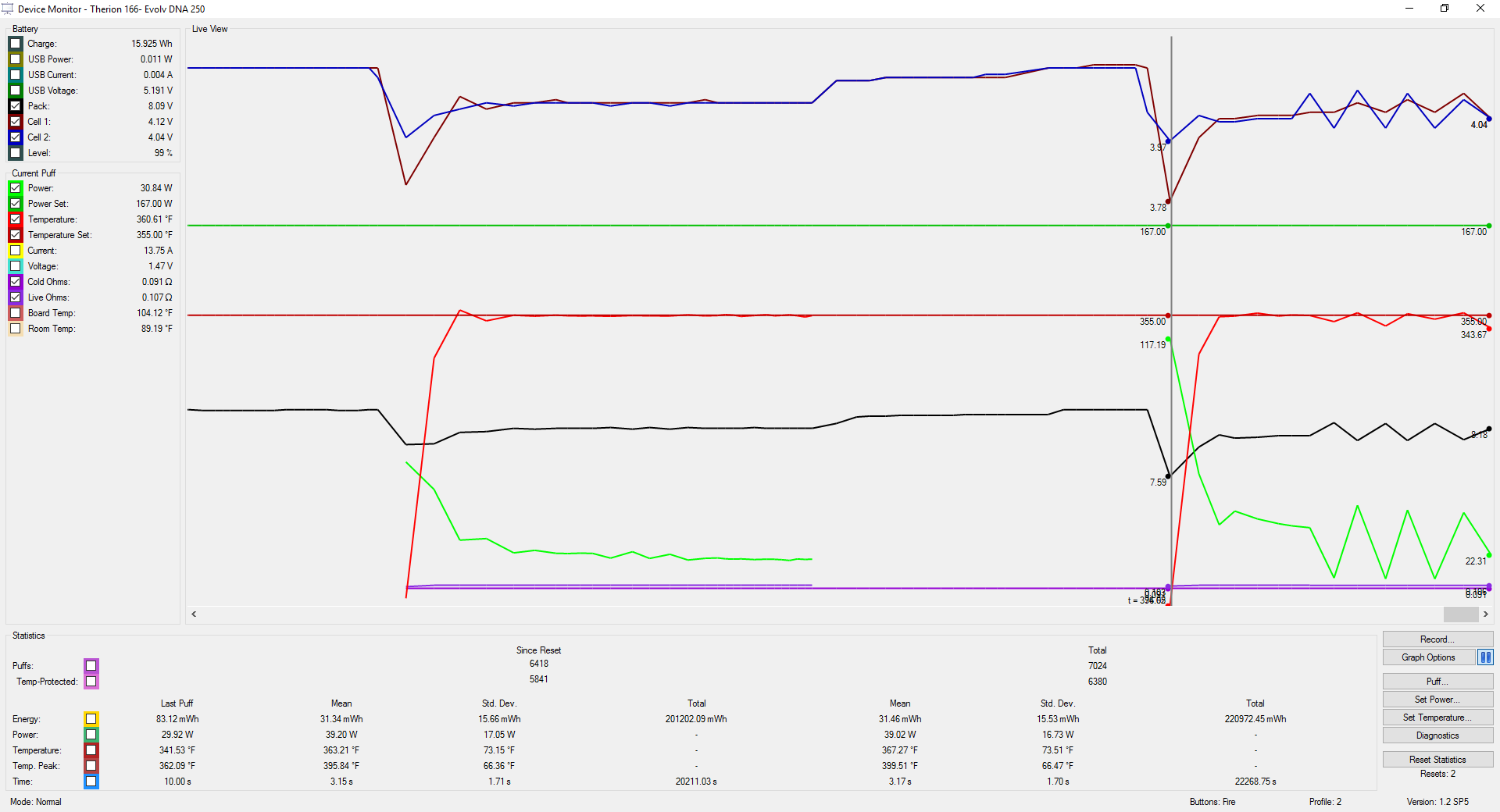 Spector NS5 RD Posted January 24, 2017 Report Posted January 24, 2017 giz_60 said:Not sure about the Kanthal limit setting...never use power mode except to burn in coils...always use TC. Here are a couple of screen shots showing 2 different fire button presses but in the same frame... what i meant was, when device acts up, move the cursor to see the lowest point of any of the 2 cells. your earlier screenshots showed some heavy voltage sag on cell 2. you need to measure the voltage when the device isn't working properly.i thought the kanthal limit carried carried over to TC, it apparently doesn't.