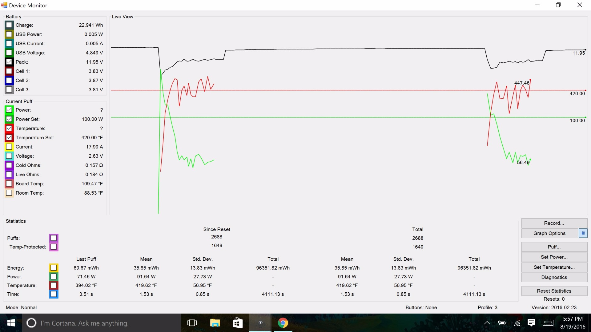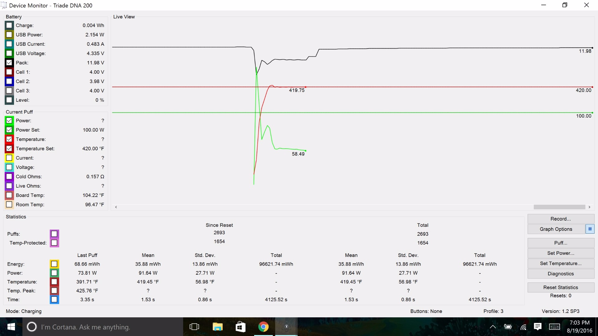 stylemessiah Posted July 28, 2016 Report Posted July 28, 2016 retird said:Can you take a screenshot in Device Monitor showing a vape. Would like to see graphed the "Pack", "Power" and "Power Set", "Temperature" and "Temperature Set"THANKS....What me?Not likely at this time of day, i dont vape inside - oversensitive smoke detectors, maybe on a warm day - (its winter and night here at the moment) when i can open the window and door to vent the vape