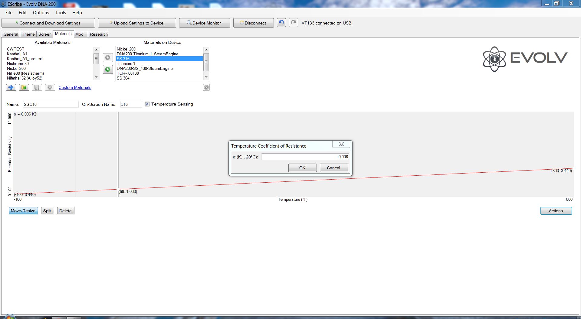 dwcraig1 Posted August 5, 2016 Report Posted August 5, 2016 Here is material tab open and with SS316 highlighted, note the graph's 800 F figure. Here is with the appellate open ready to change it. Note it is 0.006 and the line on the graph has moved to reflect this setting. No changes are made till OK is pressed and uploaded to the device. So unless you are naming your CSV's 0.006, ect. I don't understand how you see this value anywhere but in the window to change it. As far as the mod kicking out of TC, well I never got to that part.