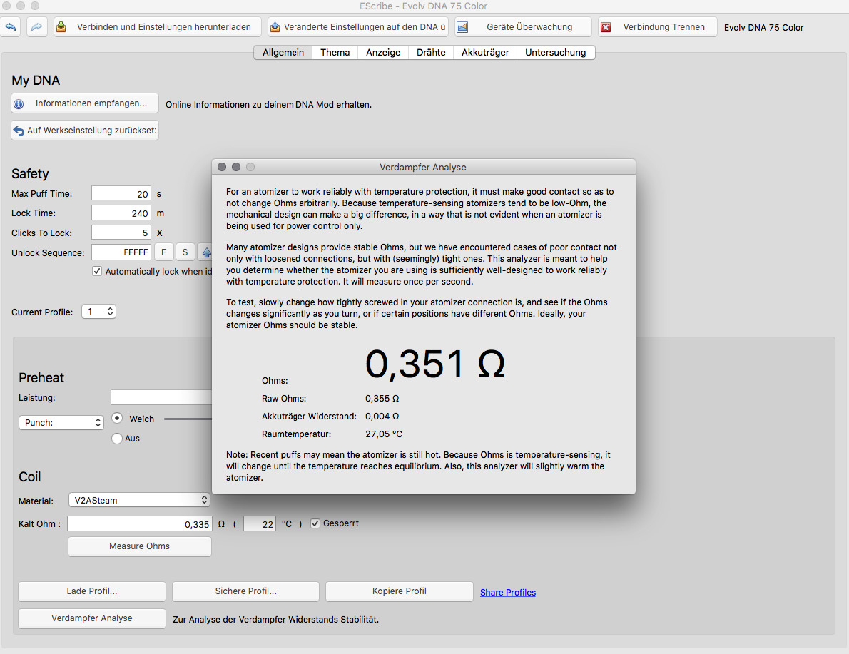 Lowbytes Posted July 13, 2017 Report Posted July 13, 2017 Hi James Beside the wrong room Temp ( seems to be 4°C too high) working accurate for me Flash E Vapor V3 - 0,37 Ohm V2A Clapton Coil manually has to be set to 0,335 reading coil resistance constant 0,351Ohm at ambient temp 27°C (real room Temp is 23°C)
