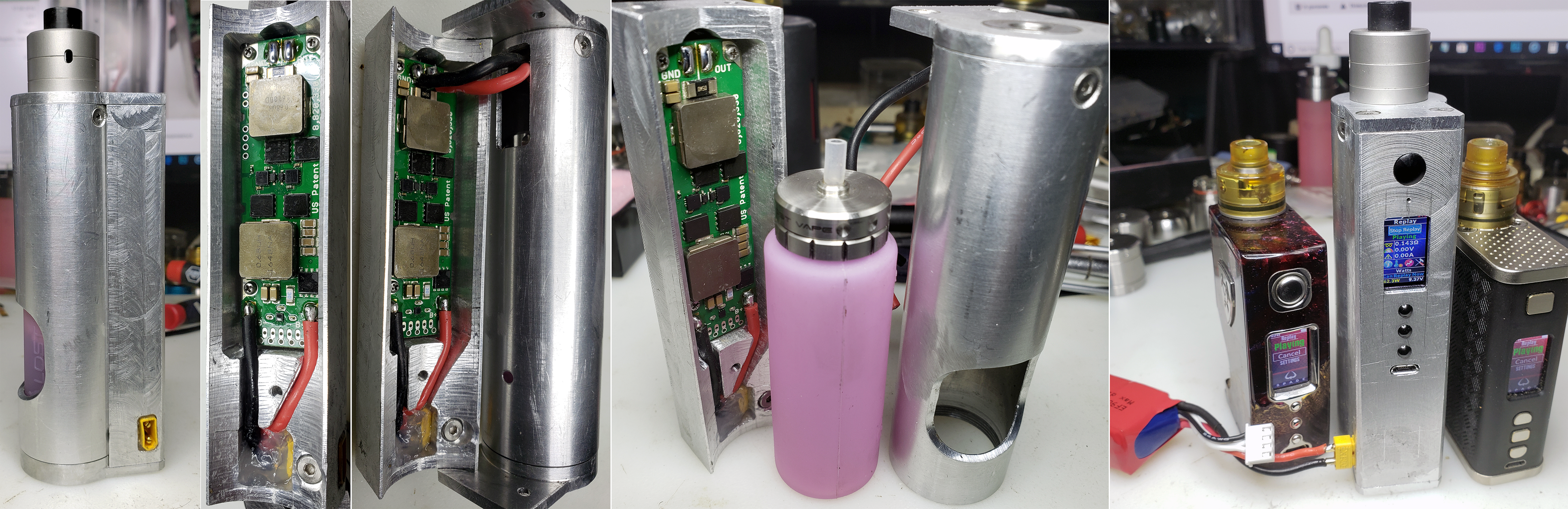 AMDtrucking Posted October 12, 2018 Report Posted October 12, 2018 (edited) Being a truck driver, I always wanted a squonk mod with more juice capacity and endless supply of battery source... The bottle compartment has to be completely insulated from PCB. The PCB, as well as MM510 connector, have to be screw onto the aluminum body of the mod, for reliable connection. 14 gauge AWG silicon wires have to be used to lower the internal resistance of the mod. Ended up making one myself. It is DNA250C mod and it has squonk bottle of 30 milliliters and powered by my truck batteries. I still need to work on the finish, right now the finish is of my lathe and mill. But it is functional, I'm testing it with 3S LiPo 40C. I've got to work on the Theme setting and get rid of the battery indicator, because it shows 1% all the time. In Escribe - Mod - Battery, I chose "Power Supply - 12V". I'm not using the board's balancing terminals, because I don't intend to charge my truck batteries via USB. I don't know why, but I drilled Ø1.0mm hole in front of the LED 😉 I keep my vaping gear in the cup holder, so my mod mast be able to stand, that's why I made power connector on the side of the mod. The sought of hanging it, like the truckers CB microphone, did cress my mind. Edited October 12, 2018 by AMDtrucking 5