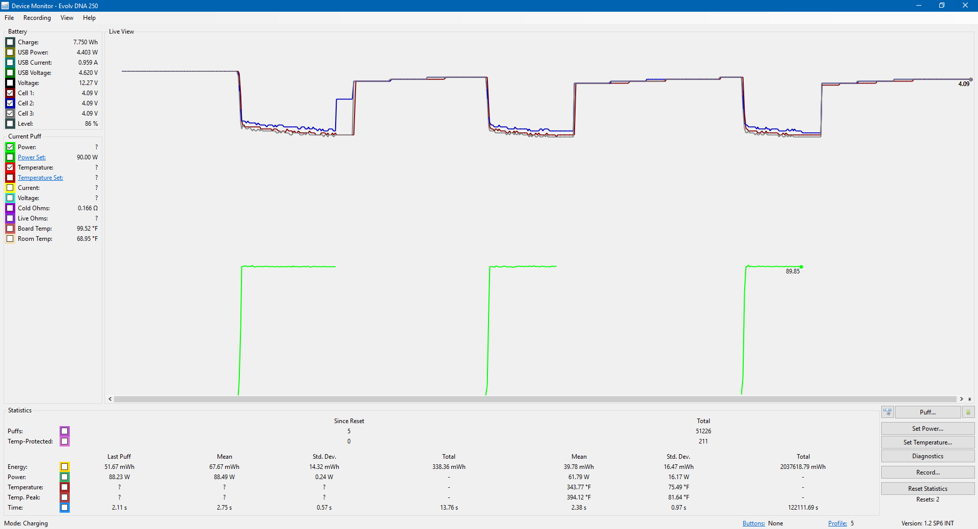 Wayneo Posted February 18, 2019 Report Posted February 18, 2019 11 minutes ago, MohKha said: Currently running an RTA at 90w but every pull I take reduces the battery by 1% so I get around 100 pulls before the battery is dead Batteries talk in volts, but you can see their performance in Device Monitor. Only Click/select cell 1-3 and post a full printscreen while firing. you might want to lower your cell soft cutoff to 2.7-3V I already answered your question 3. Live display.