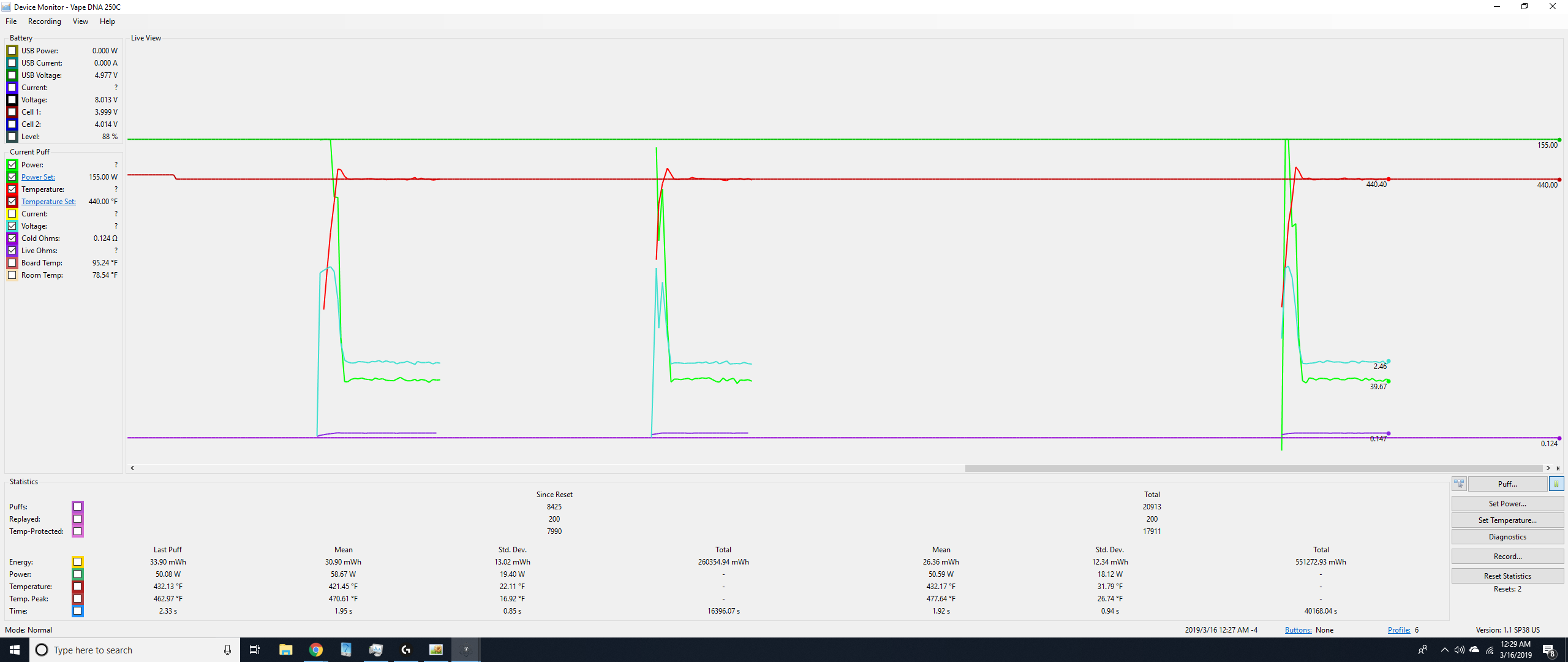 Chris Musampa Posted March 16, 2019 Report Posted March 16, 2019 (edited) As Wayneo says, you'll taste your juice better if you reduce the final ramp up speed. Your device monitor shows you need about 40 watts to maintain temperature for your draw, so maybe set power around 50 - 60 watts (experiment with it) and preheat to 155, then mess around with the punch value. If you set power and/or punch too low you'll probably notice a little spitback (as you'll be drawing while the juice is just starting to boil but not full got going yet), too high and you'll miss out on some flavour. Edited March 16, 2019 by Chris Musampa