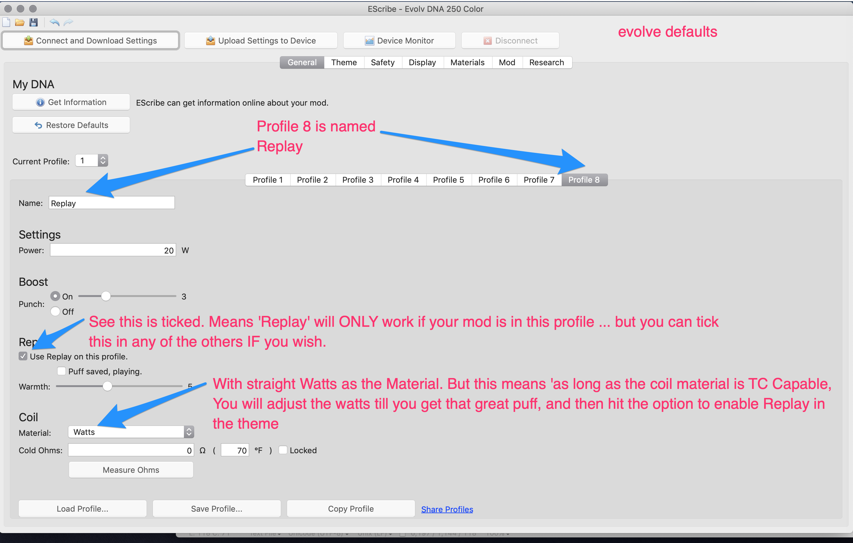 4. I reset to Evolv Default settings but Replay isn't even listed in any of the option in Current Profile 1, Profile 8