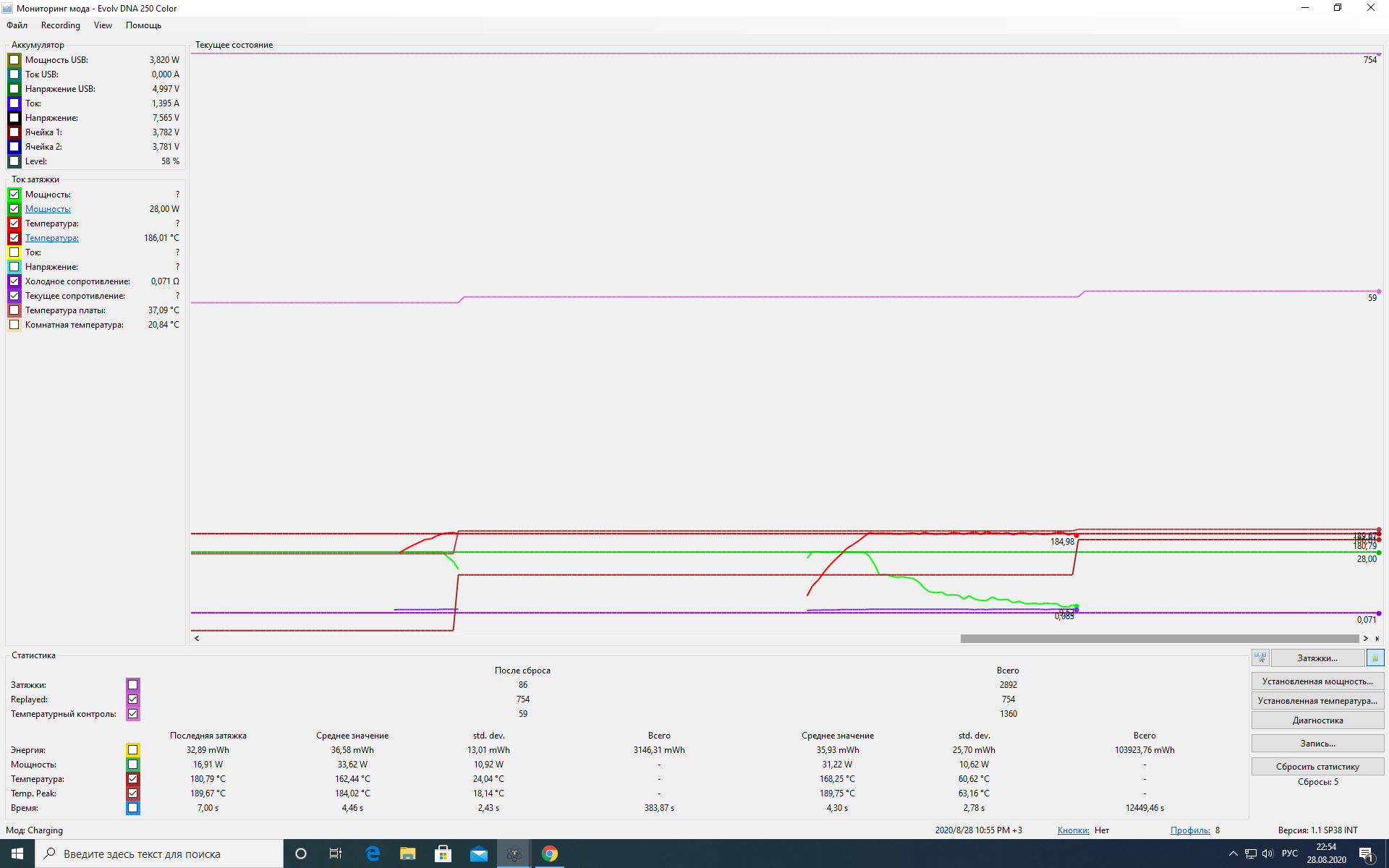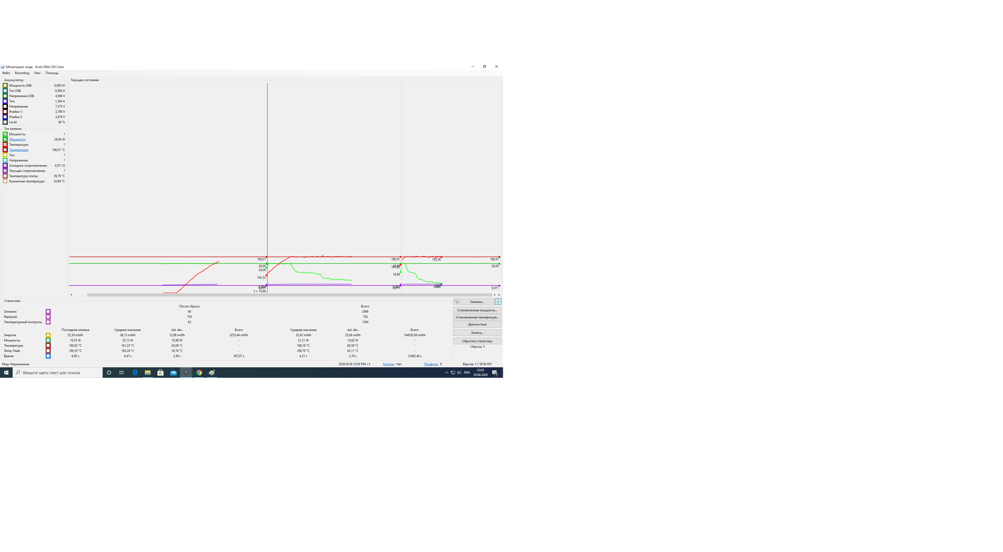 Djini Biba Posted September 12, 2020 Author Report Posted September 12, 2020 On 28.08.2020 at 21:42, dwcraig1 said: Помимо опубликованных вами фрагментов, один из Device Monitor, запускающий вашу катушку, будет наиболее полезным, Как этот: обратите внимание, что моя температура никогда не достигала установленной температуры, если бы она была в ваттах, она бы снизилась. I downloaded a profile for titanium from Enjain and the cotton wool began to burn less. I sent it on and steamed with liquid. And without liquid! why there is very little taste and cotton wool burns. Look at the second photo when creating a theme, maybe there is a mistake what is wrong with the "replay" I did not measure the internal resistance of the mod. How can I measure it cheaply and at home if there are no tools? Very difficult, no tools