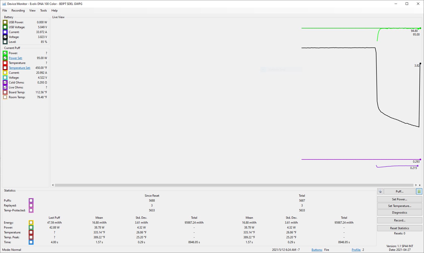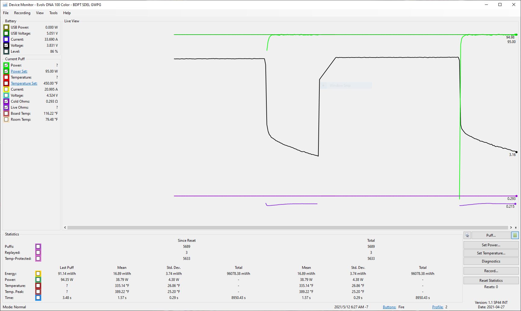 dwcraig1 Posted May 12, 2021 Report Posted May 12, 2021 My DNA100C has an 18650 Samsung 20S (30 amp) at 90% charge here. I don't have any Kanthal or Nichrome heavy enough to get really low resistance so I used some dual core SS 316 Claptons in dual coil configuration. Both firings was with the screen timed out (off) 1