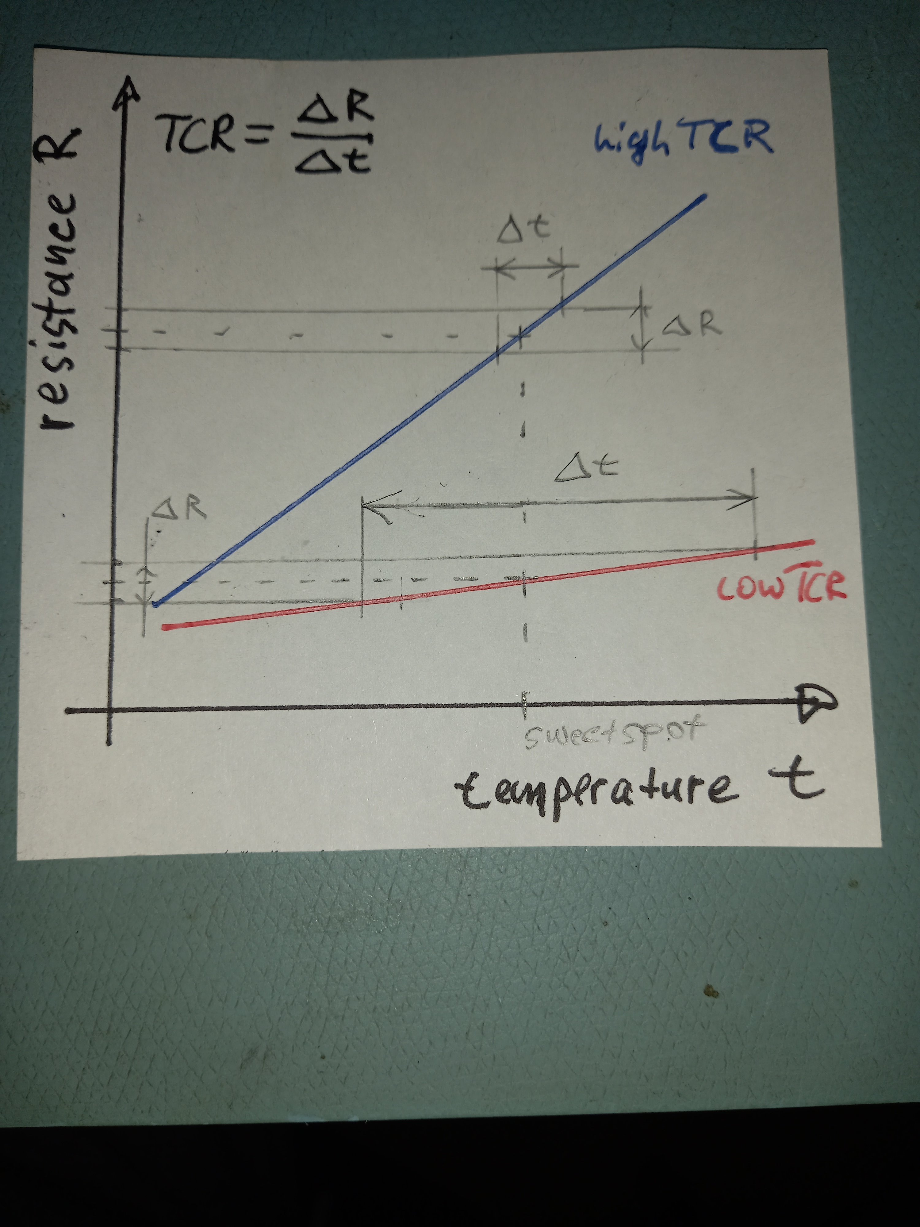 Peter_Silie Posted September 12, 2021 Author Report Posted September 12, 2021 @gwyarThank you for your answer. Let's take a closer look. vor 11 Stunden schrieb gwyar: The temperature coefficient of a material changes as soon as it is processed into a coil Sorry but that is not true. The TCR is a constant that depents on the material, and decribes how much the resistance of the material changes when it is heated. That does NOT depend on the shape of the material neither on the location. It is always the the same under a maple or beneeth an oak and even on mars. As wayneo said: steam-engine 'wire wizard' gives a good overview, any physicist table book will give the same information. Your expectations on using TC are exacly the same as mine. The problems that you achive are the same as mine, too. The reason for that is, that we don't have the right material for a proper TC setup. We should have more wire material like titanium. The reason for most problems that we have with TC is, that we don't have much choices on the material. In most cases we use SSL316 or similar, right? I try to explain: SSL has a TCR about 80, very low. Even though the DNA has a very presice measuring circuit, the resolution of that is NOT infinite. When looking to your cold resistance adjustment, you see that the smallest value, you can set is 0,001Ohm. That's the border of the resolution. (simplified) I made the picture to show what happens when you apply the same resolution (deltaR) to different TCR. You can see, that on low TCR, the deltaT value increases, that means when the controller calculates the value, a huge range of temperatures match to the same resistance (simplified again) The red graph represents materials like SLL316, the blue graph is for something like titanium or nickel. It is schematic and not symmetic, but you will get the idea...