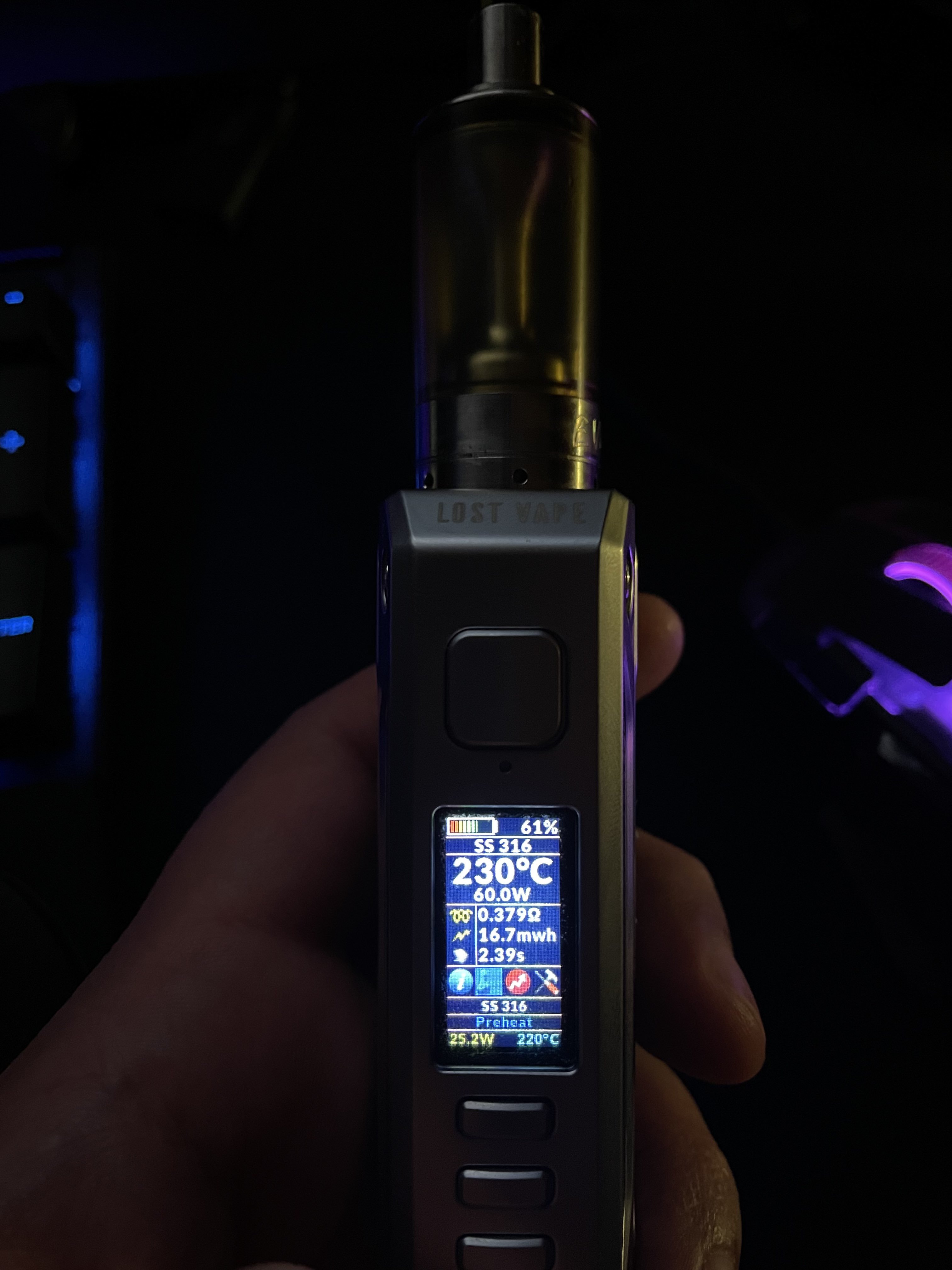 Wayneo Posted June 24, 2022 Report Posted June 24, 2022 Was there any special reason you chose 220°C? Do you look at that temp set as a high limit that you don't want to exceed, OR you really like your juice flavors at that temp, OR you're just really looking for dry hit protection? Now I'll go look at your initial post again 20 hours ago, Azax said: ... i let the coil cool down at temp room, then resample it and leave it unlocked(if i lock it, set temp to 260C but won't reach more than 155C so i leave it unlocked) Once you've checked your coil for hotspots, etc. and it's at ambient temp you should remeasure for the 'cold ohm' value. You should only need to do that again if you change to a different profile. And you very very rarely ever should need to lock your ohms. 20 hours ago, Azax said: ... vaping in TC ss mode besides (wattage from 15-100W and temp from 195-410C<which i consider unsafe) didn't understand the majority of this, but 300°C is the limit on these mods. 20 hours ago, Azax said: 1. is preheat stacking with TC ss316 wattage mode+temperature ? 2. should i enable preheat power/temperature? what are the settings for temp control+preheat pwr or temp control+preheat temp? No idea what you mean for #1 #2. No, I don't think you need preheat at all. But if you do, the 'preheat power' (75W in your case BUT disabled) should be > 'power set' (60W in your case). And it's much easier to use the slider (1-11) compared to temp unless you know the temps that your specific juice components aerosolize at. That slider says how close your coil gets to that 'Temperature set' value (220°C in your case) before ending preheat
