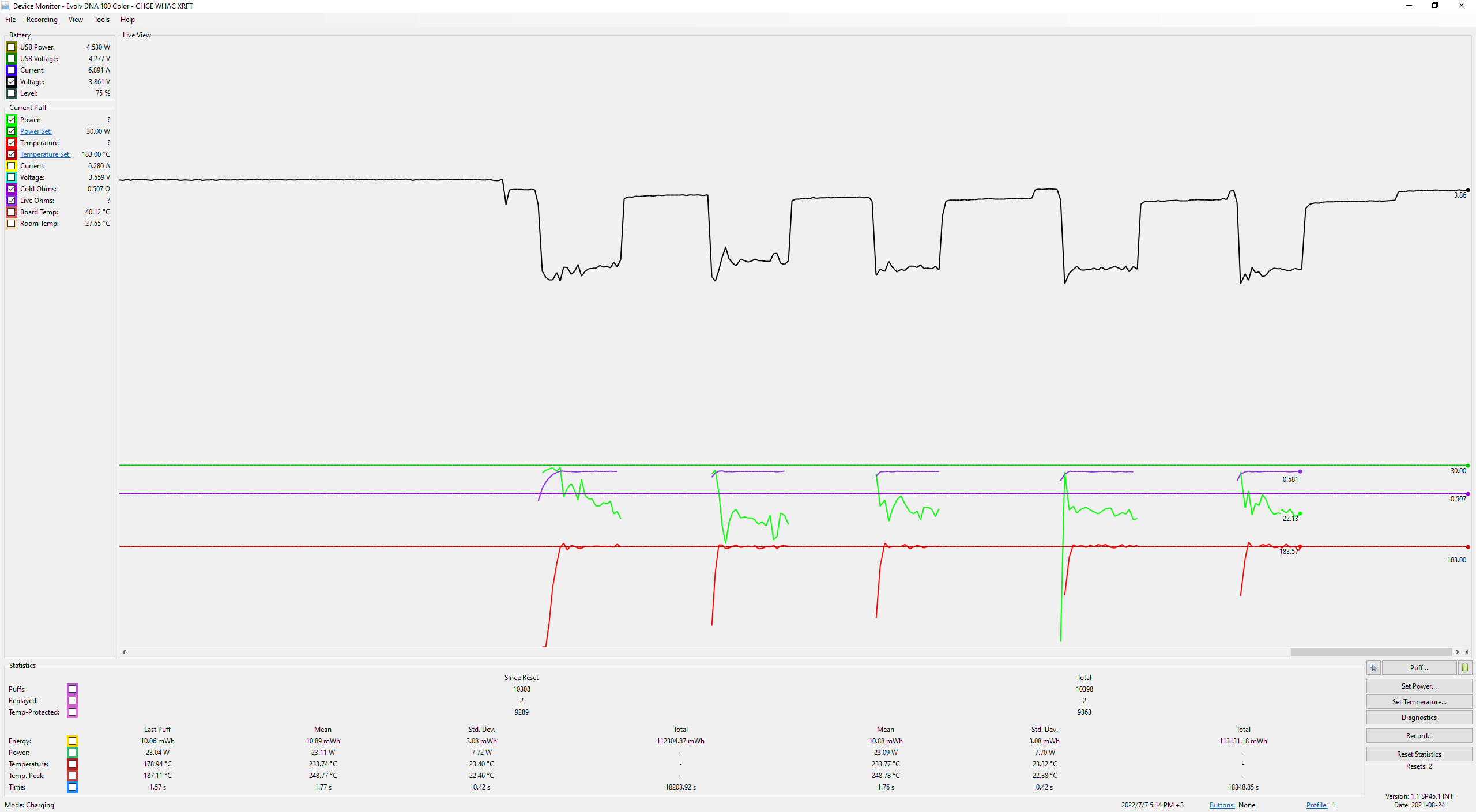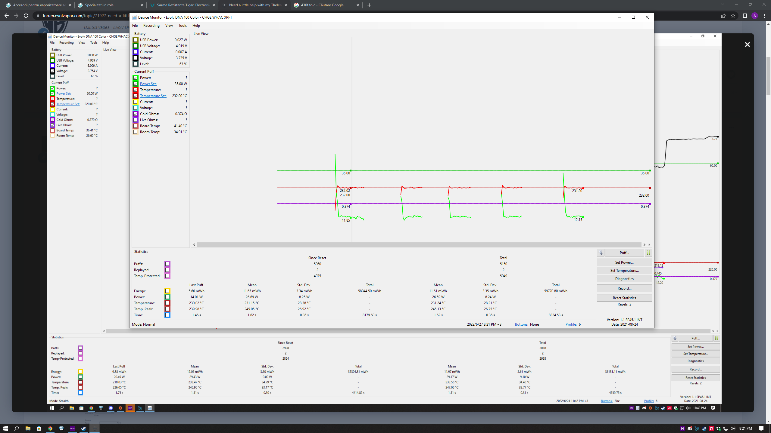 Azax Posted June 24, 2022 Author Report Posted June 24, 2022 (edited) "Can you post 2 screenshots for me. The first being a Device Monitor while firing with the 'Power', 'Power Set', 'Cold Ohm' and 'Live Ohm' checkboxes enabled. The second being the Profile you're using. When you start escribe THAT profile # is shown as 'Current Profile'." yes, it is first dna device. cold ohm you mean first vape after letting it cool down and live ohm, the next vapes after cold? "When not using TC, so straight watts, how many watts are you using for an enjoyable vape?" usually around 18-24W. Edited June 24, 2022 by Azax