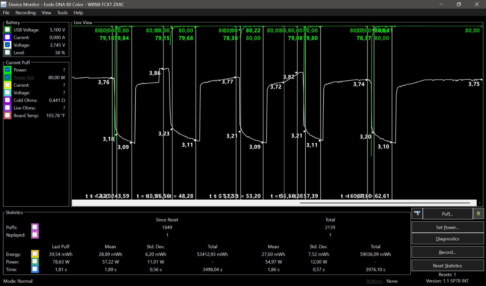 dwcraig1 Posted December 2, 2024 Report Posted December 2, 2024 Here is my DNA80C boro mod firing at 50 watts with a Samsung 20S 18650 30 amp cell. This standing voltage was 4.1 volts prior to firing (measured with meter). Note the voltage drops to 3.72 volts during firing. Compare yours firing at 50 watts with a cell of similar charge using EScribe's Device Monitor. I'm not seeing any problem with my board.