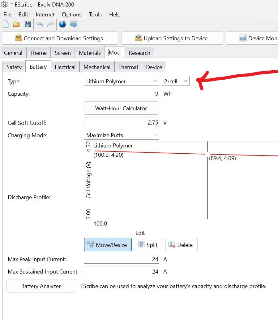 Conanthewarrior Posted February 27, 2025 Author Report Posted February 27, 2025 (edited) 11 hours ago, dwcraig1 said: Your battery settings in EScribe should look like this when using 2 cells. Does the mod still work? Yes the mods battery settings in Escribe are set to that for dual 18650 use. The mod turns on with batteries in, but just shows an empty battery and will not fire a tank or RDA. Edited February 27, 2025 by Conanthewarrior