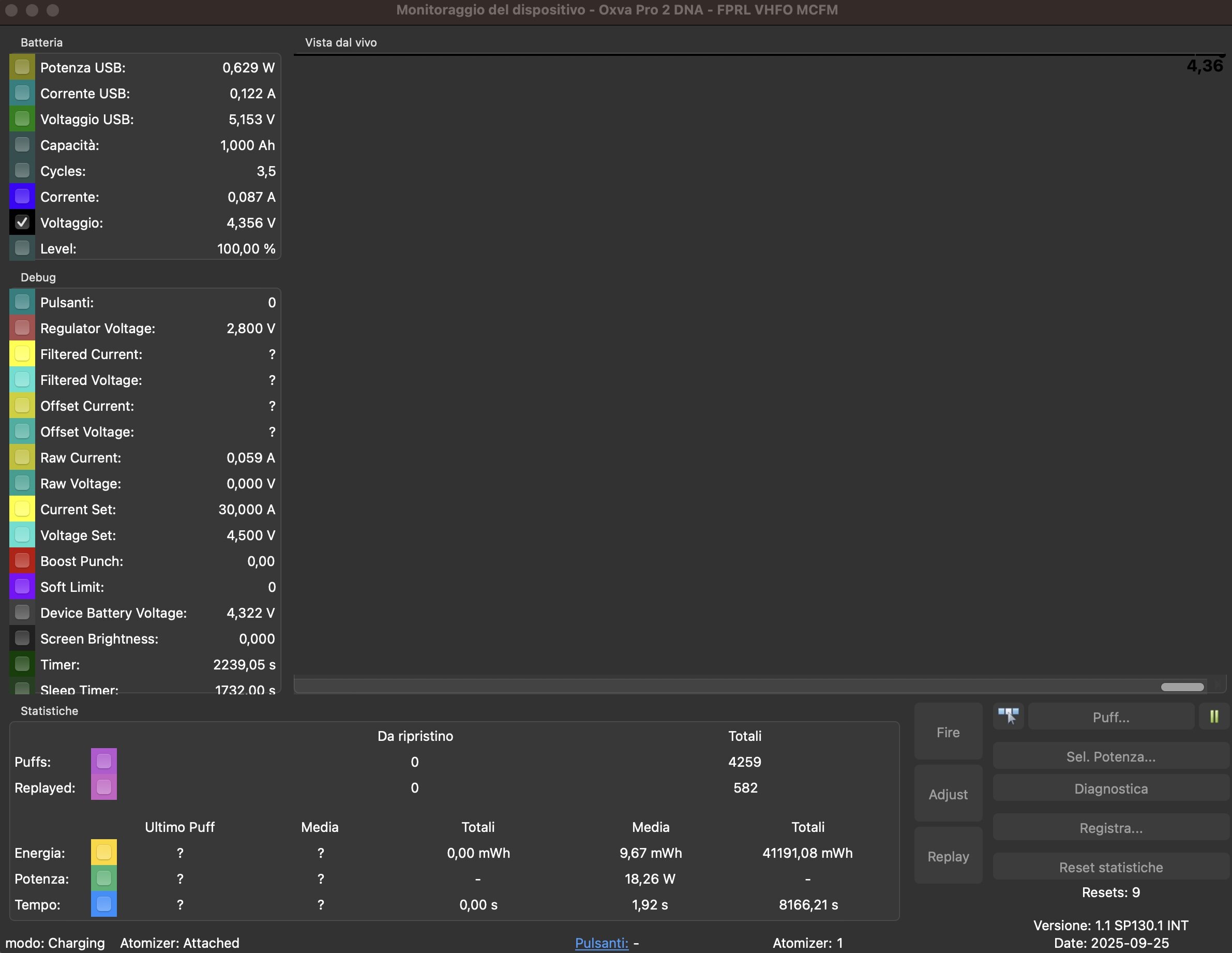 krisspug Posted 16 hours ago Report Posted 16 hours ago 12 minuti fa, James ha scritto: If you click the icon to the left of "Puff" to bring up the button simulator, and click Fire, does the screen turn on? That'd tell us if there's an issue with the physical buttons. Also, before you start Device Monitor (make sure it is closed), go to Help->About in EScribe and left click the logo seven times. This will close the window and put the program into Debug mode. Then, start Device Monitor. If you do this, click the "Debug" group on the left to bring it up. What does "Buttons" say? As to 4.16 Ohms, PWM devices like Oxva can't read over 4 Ohm. 4.16 Ohm is probably the 4 Ohms limit with calibration applied. This almost certainly means it's not reading the pod resistance, or the connection has become very bad, but clearly it's detecting that there _is_ a connection, or it wouldn't have tried to measure it at all. If you click the icon to the left of "Puff" to bring up the button simulator, and click Fire, does the screen turn on? That'd tell us if there's an issue with the physical buttons. aswer: not Also, before you start Device Monitor (make sure it is closed), go to Help->About in EScribe and left click the logo seven times. This will close the window and put the program into Debug mode. Then, start Device Monitor. answer: Done If you do this, click the "Debug" group on the left to bring it up. What does "Buttons" say? answer: 0 buttons As to 4.16 Ohms, PWM devices like Oxva can't read over 4 Ohm. 4.16 Ohm is probably the 4 Ohms limit with calibration applied. This almost certainly means it's not reading the pod resistance, or the connection has become very bad, but clearly it's detecting that there _is_ a connection, or it wouldn't have tried to measure it at all.